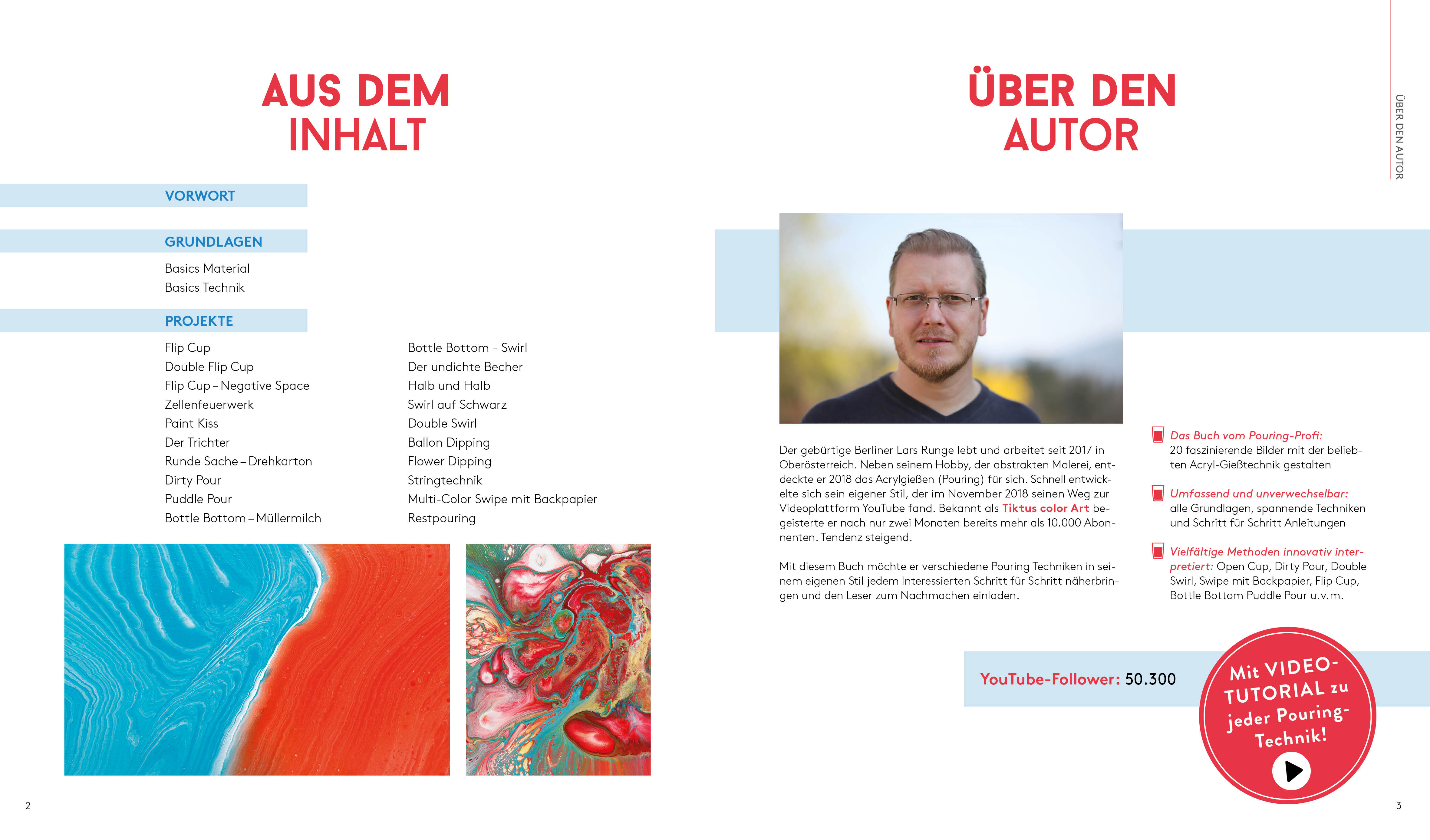 Der gebürtige Berliner Lars Runge lebt und arbeitet in Oberösterreich. Neben der abstrakten Malerei entdeckte er 2018 das Acryl gießen (Pouring) für sich. Schnell entwickelte sich sein eigener Stil, der im November 2018 seinen Weg zur Videoplattform YouTube fand. Bekannt als "Tiktus color Art" begeisterte er nach nur drei Monaten bereits mehr als 32.000 Abonnenten – Tendenz stark steigend. YouTube: https://bit.ly/2IbfjVP
