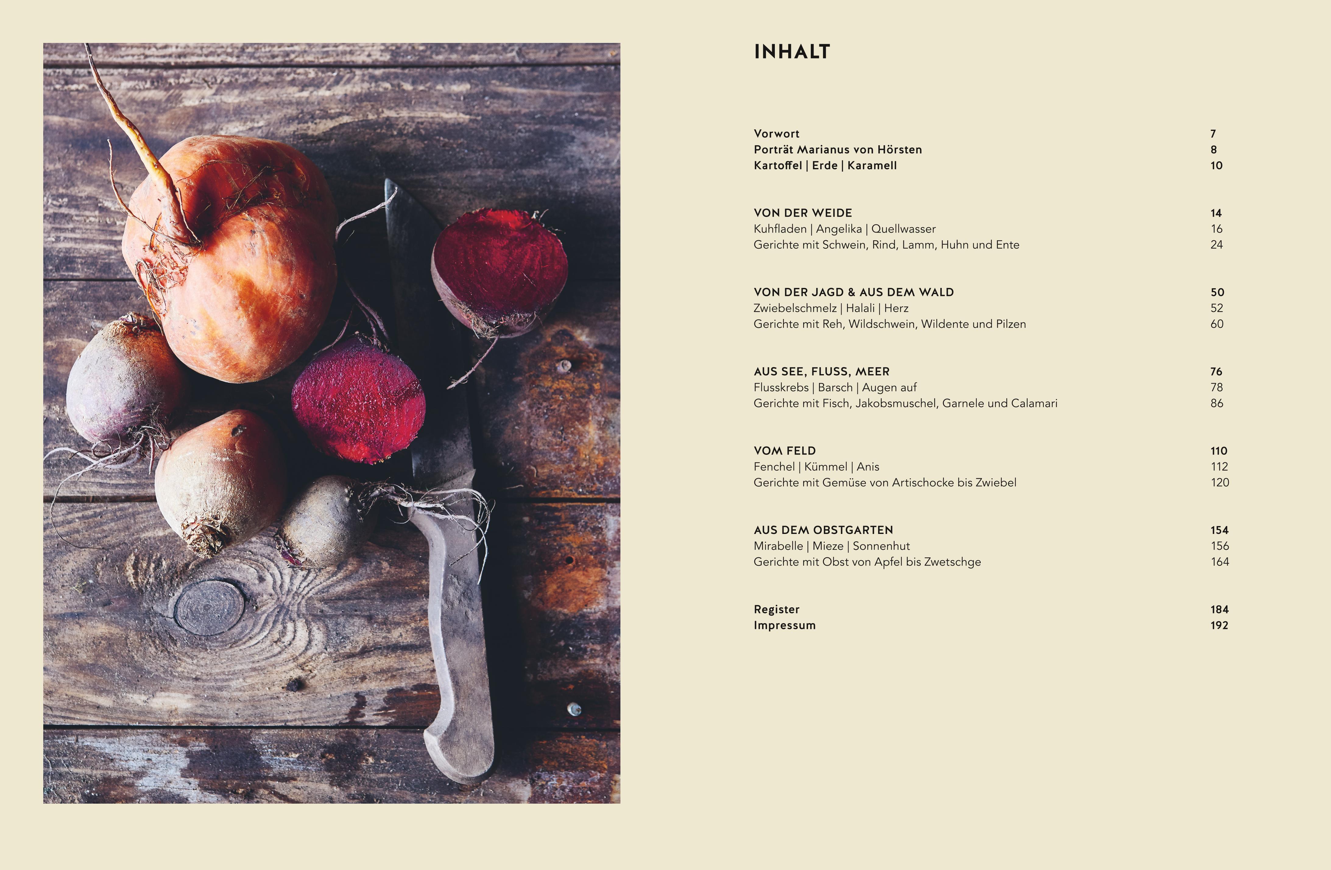 Marianus von Hörsten, Gewinner des »Next Chef Award« 2018 und Gewinner des »Global Young Chefs Challenge Weltfinale« 2017 in Lyon, ist ausgebildeter Koch und studierte Geographie. Er wuchs auf dem Demeter-Hof seiner Eltern in der Lüneburger Heide auf. Noch heute bezieht er einen Teil der Lebensmittel, die er in seinem Restaurant »KLINKER« in Hamburg verarbeitet, von dort. Er hat eine enge Beziehung zur naturnahen Landwirtschaft und weiß die Produkte der jeweiligen Saison meisterhaft zu kombinieren und kunstvoll zu arrangieren.