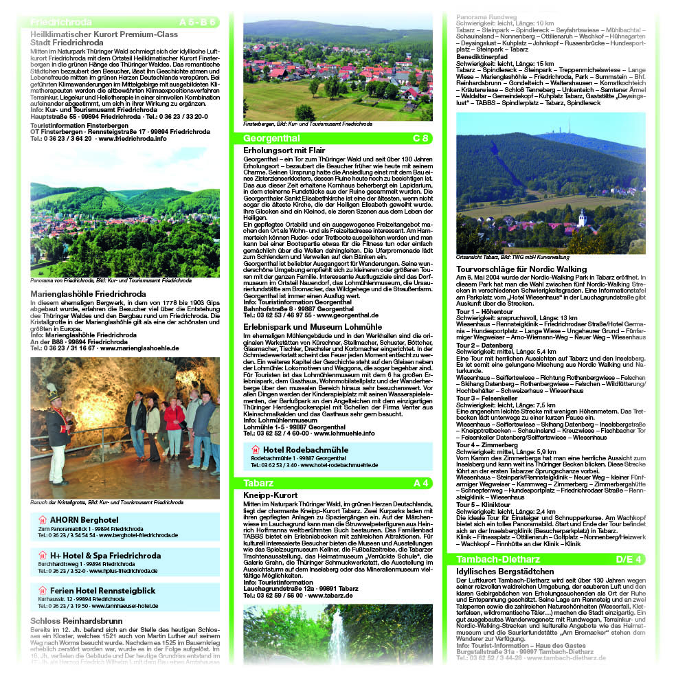 Die Wanderkarte verschafft dem Benutzer einen hilfreichen Überblick über eines der bekanntesten Erholungsgebiete Deutschlands: den Thüringer Wald. Der Wanderer kann zwischen vielen regionalen themenbezogenen Wanderstrecken und dem bekannten Rennsteig durch Fichten- und Buchenwälder auf Höhen bis zu 730 m ü. NN wählen. Im Kartenteil markiert, findet man auf der Rückseite entsprechende Beschreibungen der Routen. Zusätzlich werden dort Infos zu den Orten der Region wie Brotterode oder Georgenthal, oft ergänzt um Wandervorschläge, präsentiert. Fotos bieten einen ersten Eindruck, eine Nebenkarte bis Schmalkalden komplettiert die Kartenrückseite.
