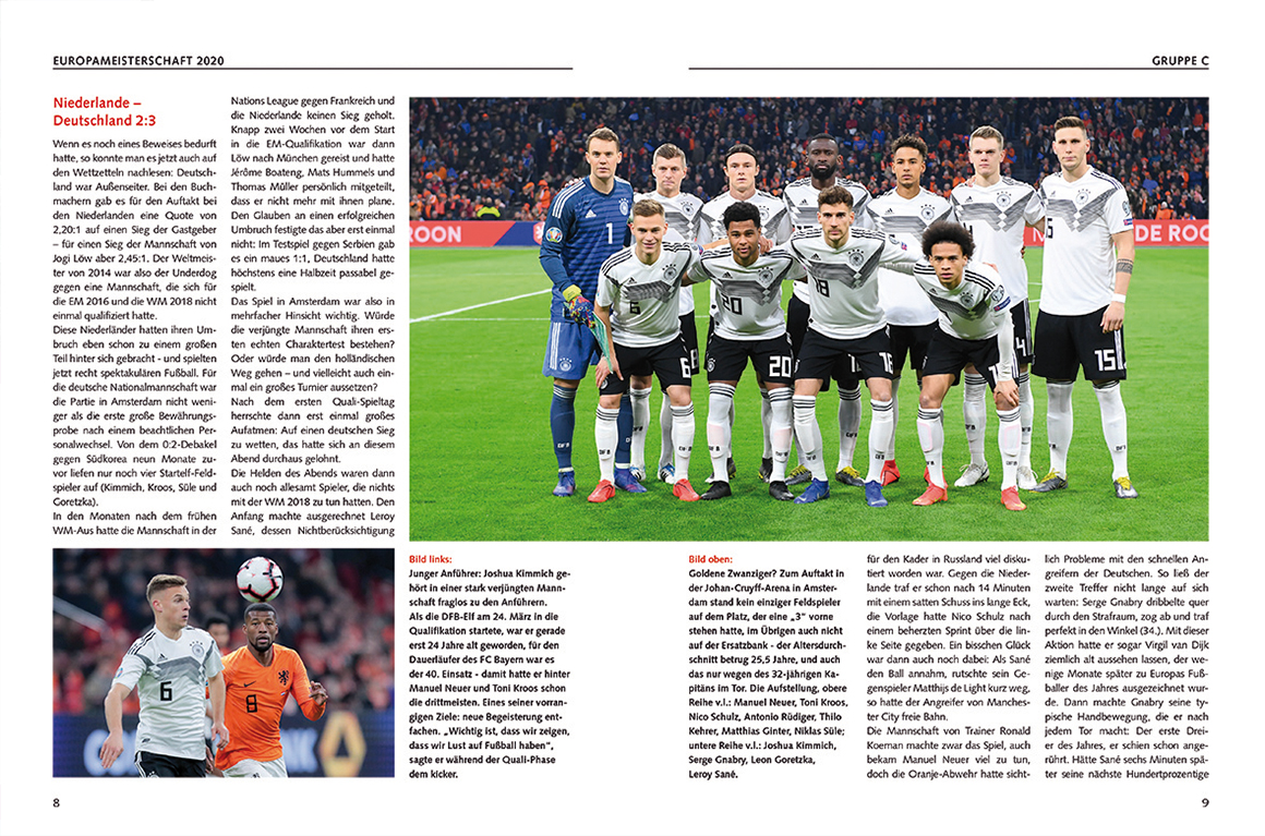 Das Umbruchjahr der deutschen Fußballnationalmannschaft begann mit einem Auftakt nach Maß. Gleich das erste Qualifikationsspiel in Amsterdam gegen die Niederlande wurde mit 3:2 gewonnen. Im letzten Qualifikationsspiel sicherten sich dann Gnabry & Co mit einem souveränen 6:1 gegen Nordirland vor einem begeisterten Publikum in Frankfurt den Gruppensieg. In Kommentaren und tabellarisch werden alle Spiele erfasst, in den sich die besten europäischen Mannschaften bislang durchsetzen konnten. Auslosung und Spielplan werden übersichtlich aufbereitet. Welche Gegner treffen in der Vorrunde aufeinander und wie wird es dann weitergehen? Wie wird sich die EM im Einzelnen von Tag zu Tag abspielen, vom Eröffnungsspiel am 12. Juni im Olympiastadion in Rom bis zum Finale am 12. Juli im Wembley-Stadion in London. Kurz, unsere Vorschau bietet in Wort und Bild alle Hintergrundinformationen, die man braucht, um im Vorfeld der EM 2020 Bescheid zu wissen.