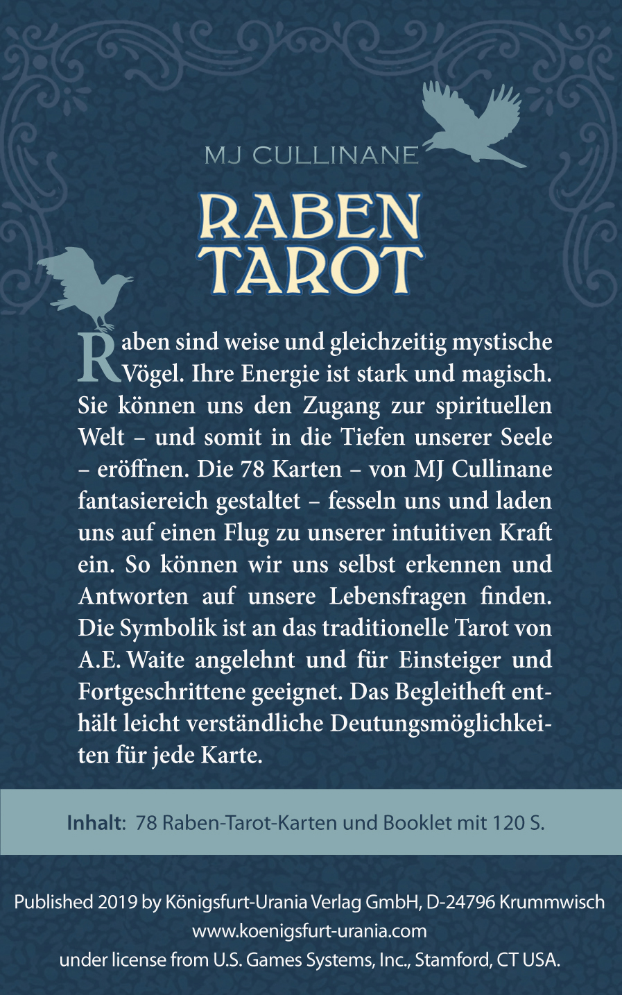 Inhalt: 78 Raben-Tarot-Karten und Booklet mit 120 Seiten in einer Klappdeckelschachtel mit Magnetverschluss