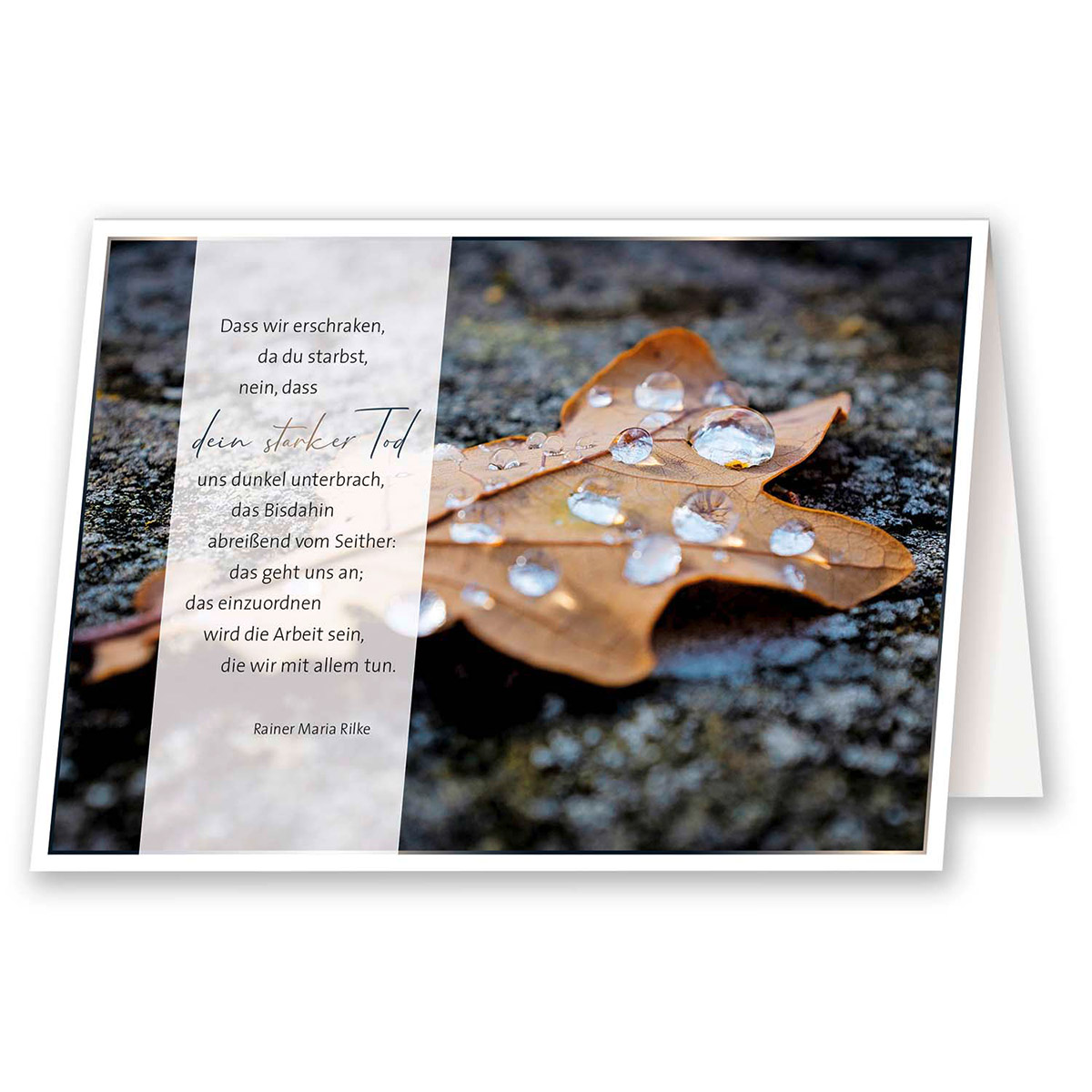 | Schlagworte | Doppelkarten • Faltkarten • Klappkarten • Kondolenz • Kondolenzkarten • Rainer Maria Rilke • Rilke • Spruchkarten • Trauerkarten |