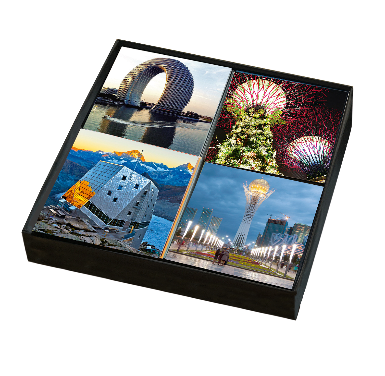 Wer träumt davon nicht? Von einem Trip zu den spektakulärsten Bauten der Welt. Mit diesem Memo holen Sie sich die innovativsten Ikonen zeitgenössischen Lebens und Wohnens nach Haus. Mit Spaß am Spiel lassen sich Tiny Houses, Green Buildings, Capsule Homes, Ice Churches, aber auch urbane Museen und grüne „Biome“ erkunden, wie zum Beispiel das berühmte „Eden Projekt“ in Cornwall. Ebenfalls mit dabei: das „Drehsolarhaus“ in Freiburg, die „Cube Houses“ in Rotterdam, das „Treehotel“ in Schweden oder die nachts leuchtenden „Super Trees“ in Singapur. Lernen Sie auch renommierte Architekten kennen: z. B. Frank Gehry, den „Erfinder“ des „Seattle Center“. Ob eindrucksvolle Bauten aus Eis, versteckte Erdhaussiedlungen unter Gras, riesige Glaskuppeln oder skurrile Bäume: langweilig ist garantiert keine dieser markanten Stätten, die Sie auf den 72 Spielkarten entdecken.