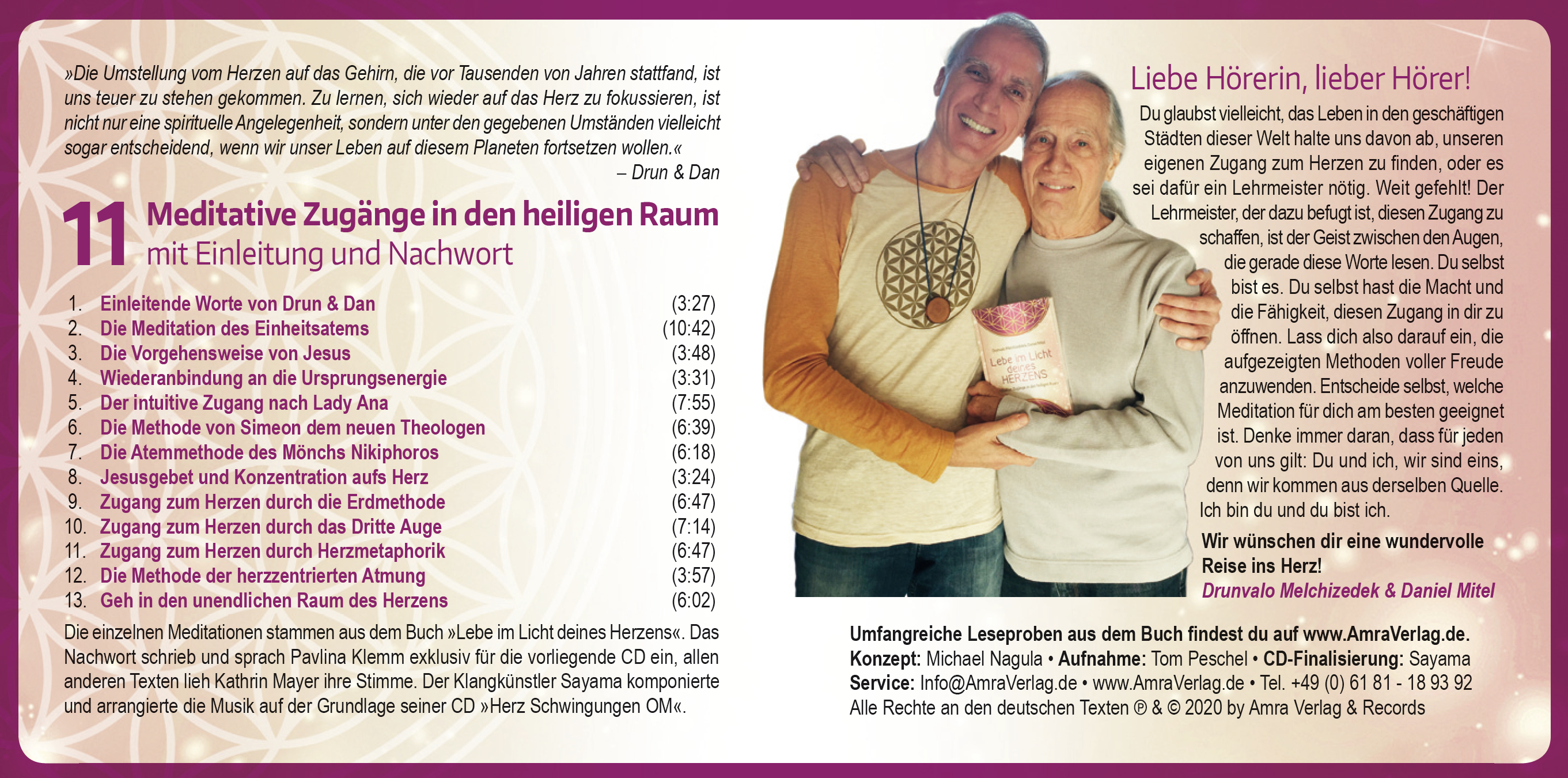 Liebe Hörerin, lieber Hörer! Du glaubst vielleicht, das Leben in den geschäftigen Städten dieser Welt halte uns davon ab, unseren eigenen Zugang zum Herzen zu finden, oder es sei dafür ein Lehrmeister nötig. Weit gefehlt! Der Lehrmeister, der dazu befugt ist, diesen Zugang zu schaffen, ist der Geist zwischen den Augen, die gerade diese Worte lesen. Du selbst bist es. Du selbst hast die Macht und die Fähigkeit, diesen Zugang in dir zu öffnen. Lass dich also darauf ein, die aufgezeigten Methoden voller Freude anzuwenden. Entscheide selbst, welche Meditation für dich am besten geeignet ist. Denke immer daran, dass für jeden von uns gilt: Du und ich, wir sind eins, denn wir kommen aus derselben Quelle. Ich bin du und du bist ich. Wir wünschen dir eine wundervolle Reise ins Herz! Drunvalo Melchizedek & Daniel Mitel