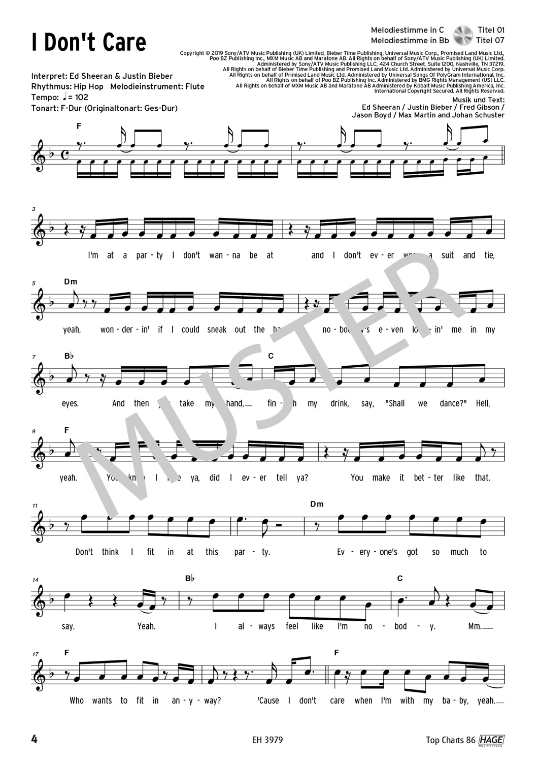 Melodiestimme mit Akkorden, vollständigem Songtext, Soundvorschlägen, Tempohinweisen und Rhythmusangaben. Auch geeignet für Violine und Flöte.