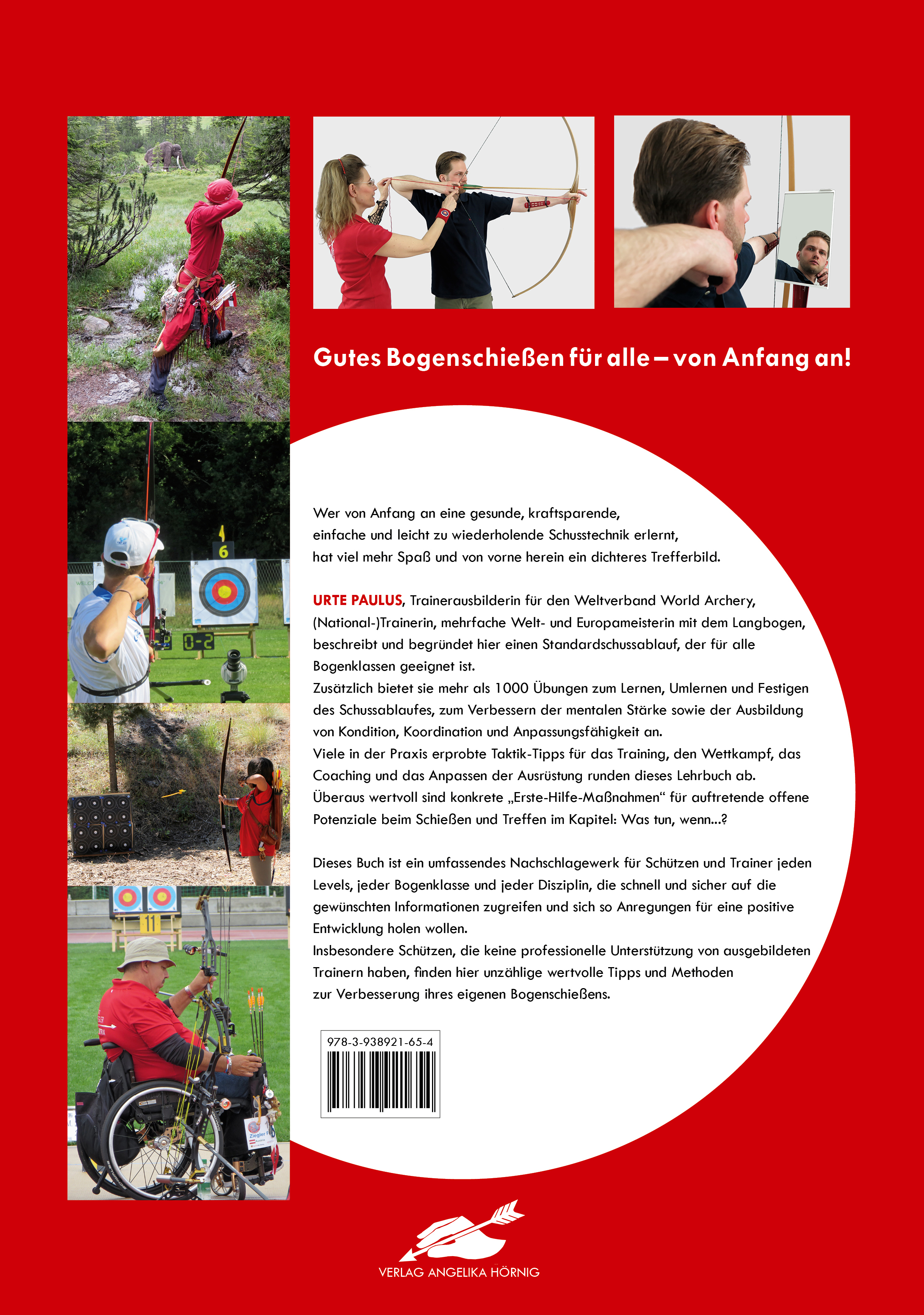 | Schlagworte | 3D Bogensport • Anfänger • Ausrüstung • Bogenschießen • Bogenschützen • Bogensport • Coaching • Compound • Hobbyschützen • Langbogen • Lehrbuch • Leistungsschützen • Mentaltraining • Recurvebogen • Schussablauf • Schusstechnik • Trainer • Wettkampf |