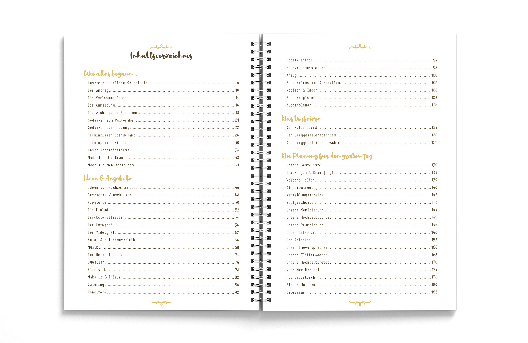 Der Videograf | Auto- & Kutschenverleih | Musik | Der Hochzeitstanz | Juwelier | Floristik | Make-up & Frisur | Catering | Konditorei | Hotel/Pension | Hochzeitsausstatter | Anzug | Accessoires und Dekoration | Notizen & Ideen | Adressregister | Budgetplaner