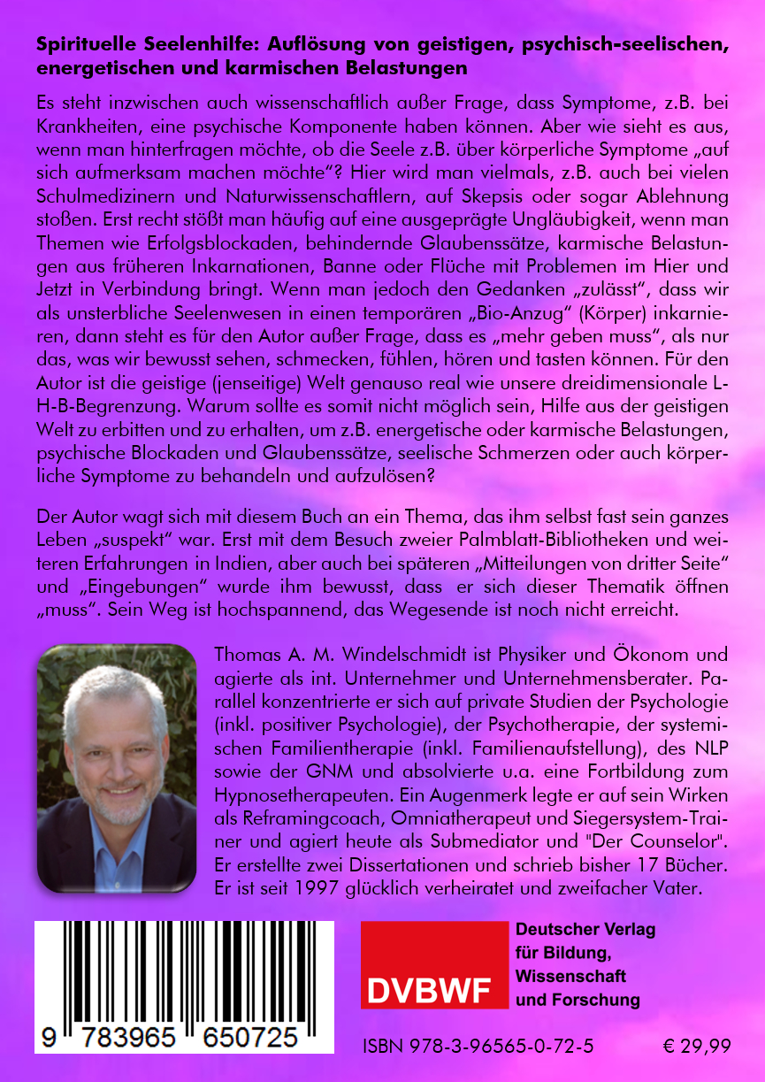 Für den Autor ist die geistige (jenseitige) Welt genauso real, wie unsere dreidimensionale L-H-B-Begrenzung. Ist es möglich, Hilfe aus der geistigen Welt zu erbitten und zu erhalten, um z.B. energetische oder karmische Belastungen, psychische Blockaden und Glaubenssätze, seelische Schmerzen oder auch körperliche Symptome zu behandeln und aufzulösen?