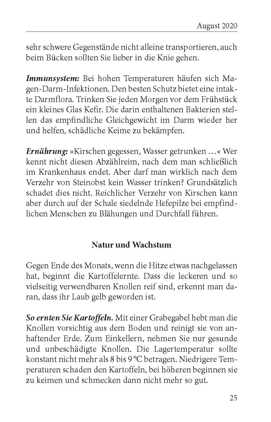 Dieser Kalender ist das Ergebnis alter Erfahrungen und Aufzeichnungen. Sie finden hier – für jeden Tag des Jahres – wertvolle Hinweise und Vorschläge: für Ihre Gesundheit, Ihre Fitness, Ihr Wohlbefinden, das aktuell erntefrisch erhältliche Gemüse und nicht zuletzt für die Pflanzen auf Ihrem Balkon und im Garten.