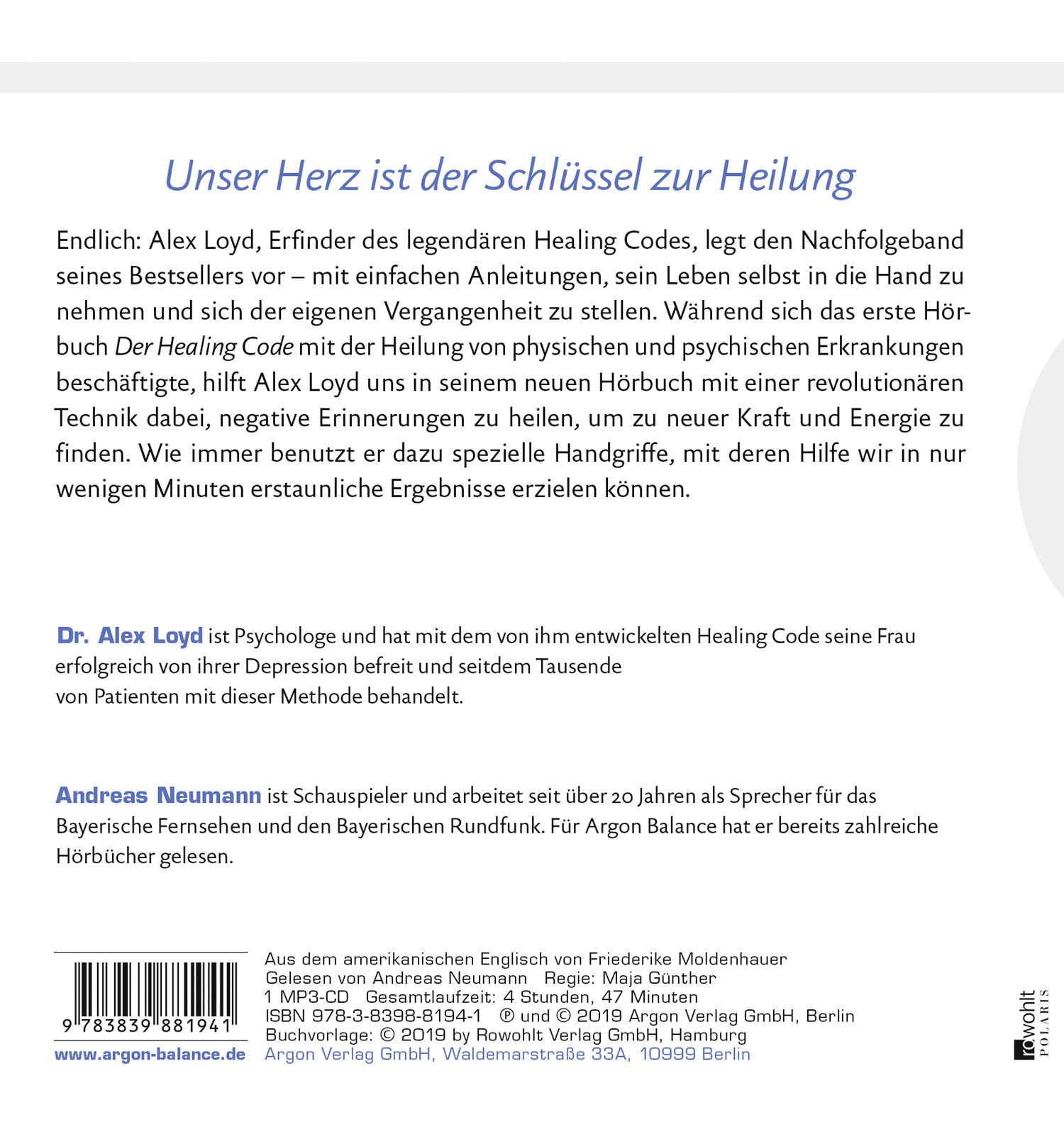 Endlich: Alex Loyd, Erfinder des legendären Healing Codes, legt den Nachfolgeband seines Bestsellers vor - mit einfachen Anleitungen, sein Leben selbst in die Hand zu nehmen und sich der eigenen Vergangenheit zu stellen. Während sich der erste Band "Der Healing Code" mit der Heilung von physischen und psychischen Erkrankungen beschäftigte, geht der zweite Band nun tiefer: Alex Loyd bietet ein revolutionäres Programm an, mit dem wir die Auswirkungen von Enttäuschungen und Verletzungen, aber auch negative Prägungen und Verhaltensmuster verändern können.