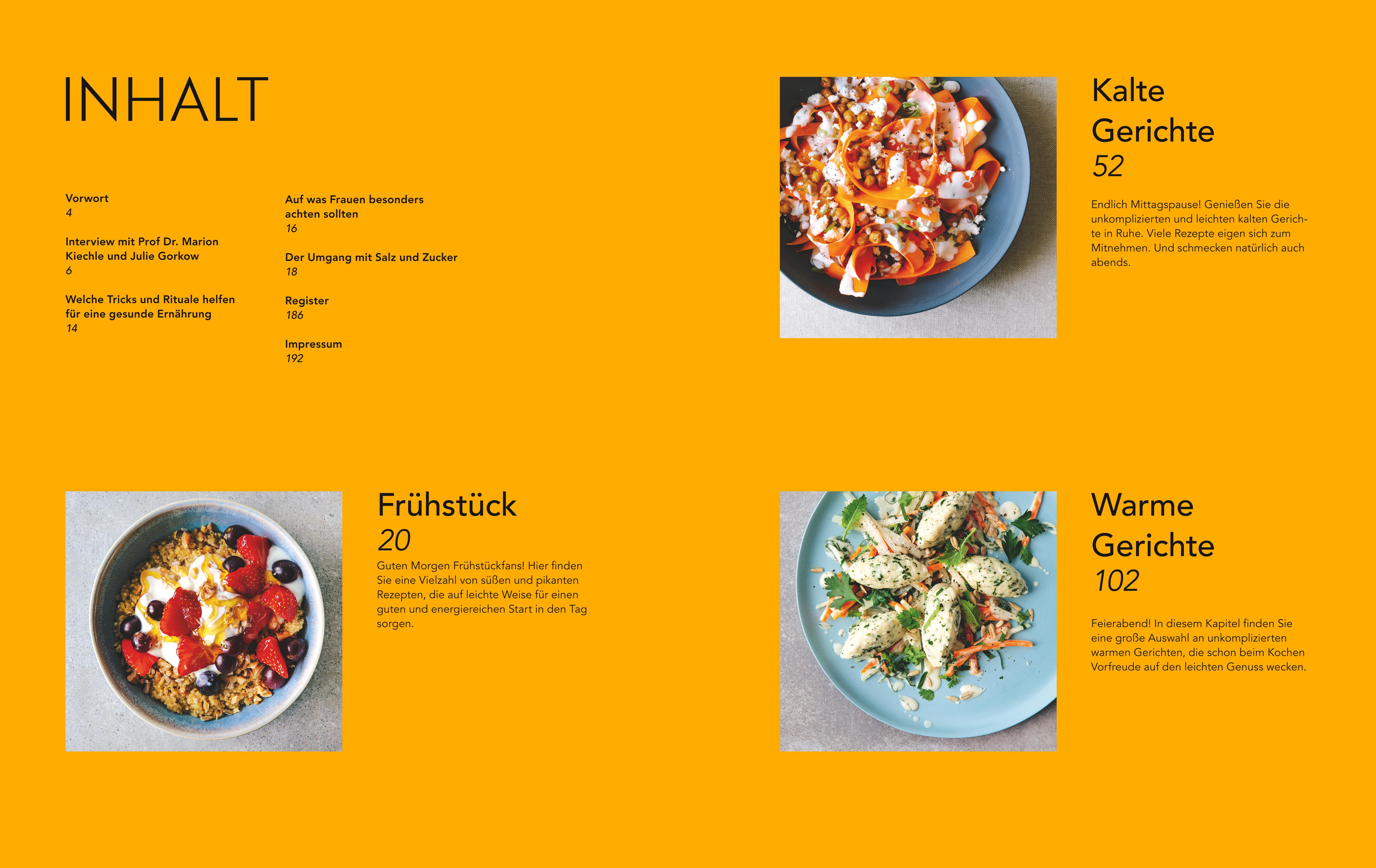 Hinweis zur OptimierungImpressumBackofenhinweisVorwortInterview mit Prof. Dr. med. Marion Kiechle und Julie GorkowAuf was Frauen besonders achten solltenDer Umgang mit Salz und ZuckerFrühstückKalte GerichteWarme GerichteRegisterAutorinnenFotografin