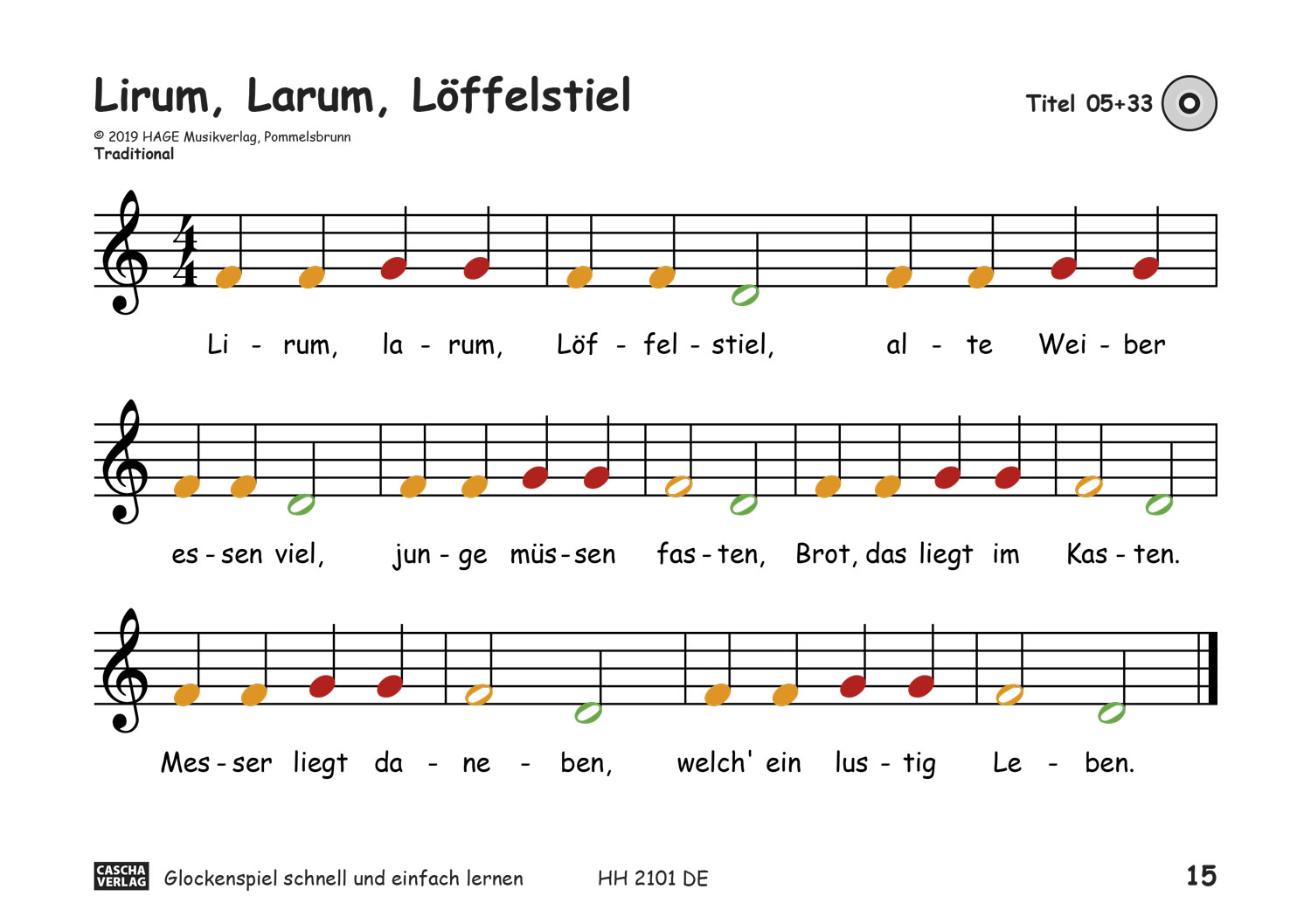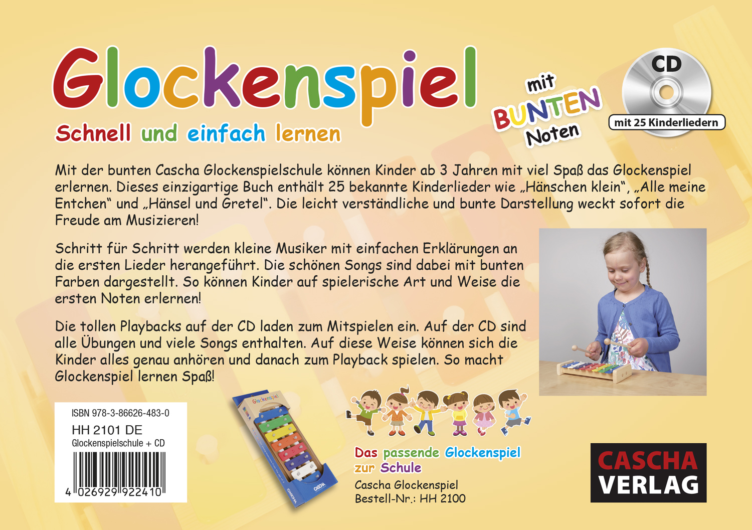 Mit der bunten Cascha Glockenspielschule können Kinder ab 3 Jahren mit viel Spaß das Glockenspiel erlernen. Dieses einzigartige Buch enthält 25 bekannte Kinderlieder wie "Hänschen klein", "Alle meine Entchen" und "Hänsel und Gretel". Die leicht verständliche und bunte Darstellung weckt sofort die Freude am Musizieren.Schritt für Schritt werden kleine Musiker mit einfachen Erklärungen an die ersten Lieder herangeführt. Die schönen Songs sind dabei mit bunten Farben dargestellt. So können Kinder auf spielerische Art und Weise die ersten Noten erlenen!Die tollen Playbacks auf der CD laden zum Mitspielen ein. Auf der CD sind alle Übungen und viele Songs enthalten. Auf diese Weise können sich die Kinder alles genau anhören und danach zum Playback spielen. So macht Glockenspiel lernen Spaß!