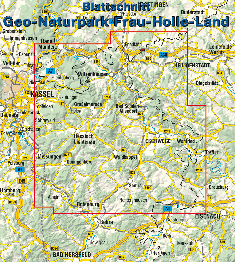 Die neue reiß- und wetterfeste Rad- und Wanderkarte "Geo-Naturpark Frau-Holle-Land" stellt den gesamten Geo-Naturpark mit seinem Rad- und Wanderwegenetz vor. Sie schließt damit an die Rad- und Wanderkarte Naturpark Münden und die Rad- und Wanderkarte Wartburgkreis an.