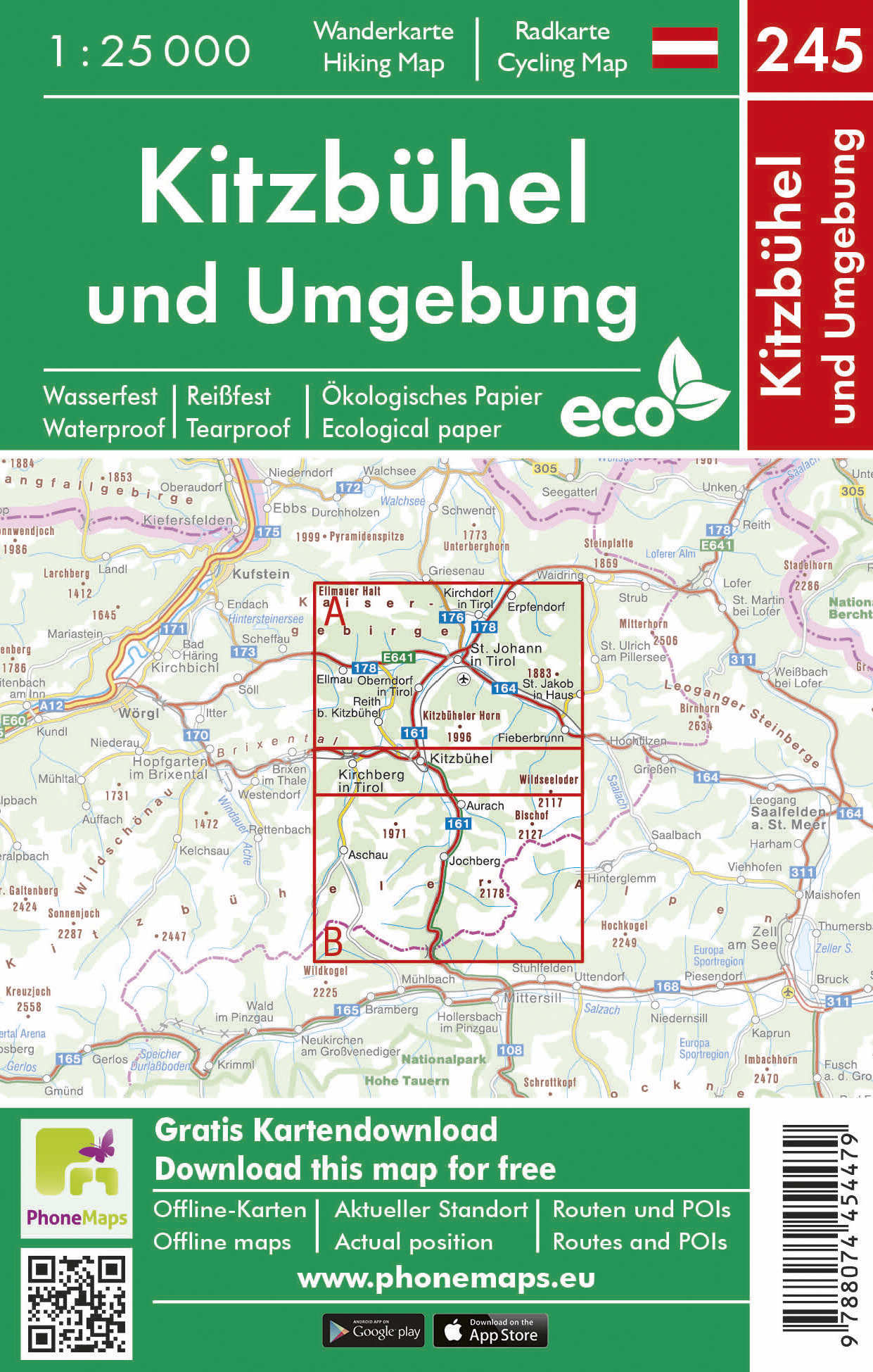 Die Wanderkarte Kitzbühel und Umgebung im Maßstab 1:25 000, von Edition PhoneMaps, zeigt die Region um Kitzbühel. Die Wanderkarte enthält markierte Wander- und Radwege sowie Wander und Radinformationen. Die Karte ist auf einem innovativen ökologischen Papier produziert. Das Papier ist naturfreundlich, recycelbar, wasserfest und unzerreißbar und somit ideal für Outdoor-Aktivitäten. Die Karte ist mit der App des gleichen Namens verbunden. Damit kann der Benutzer detaillierte Wander- und Radkarten aus ganze Europa kostenlos herunterladen.
