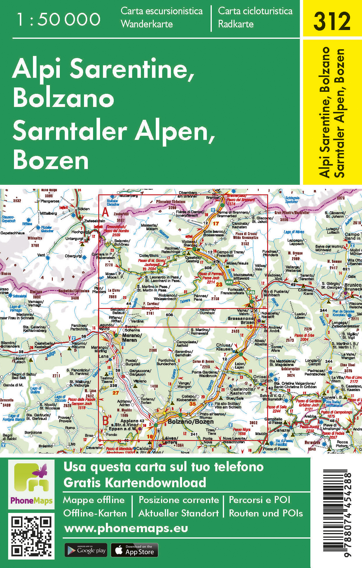 Die Wanderkarte Sarntaler Alpen, Bozen im Maßstab 1:50 000, von Edition PhoneMaps, zeigt die Sarntaler Alpen zwischen Bozen, Meran, Brixen und dem Brennerpass. Die Wanderkarte enthält markierte Wander- und Radwege sowie touristische und Radinformationen. Die Karte ist mit der App des gleichen Namens verbunden. Damit kann der Benutzer detaillierte Wander- und Radkarten aus ganze Europa kostenlos herunterladen.