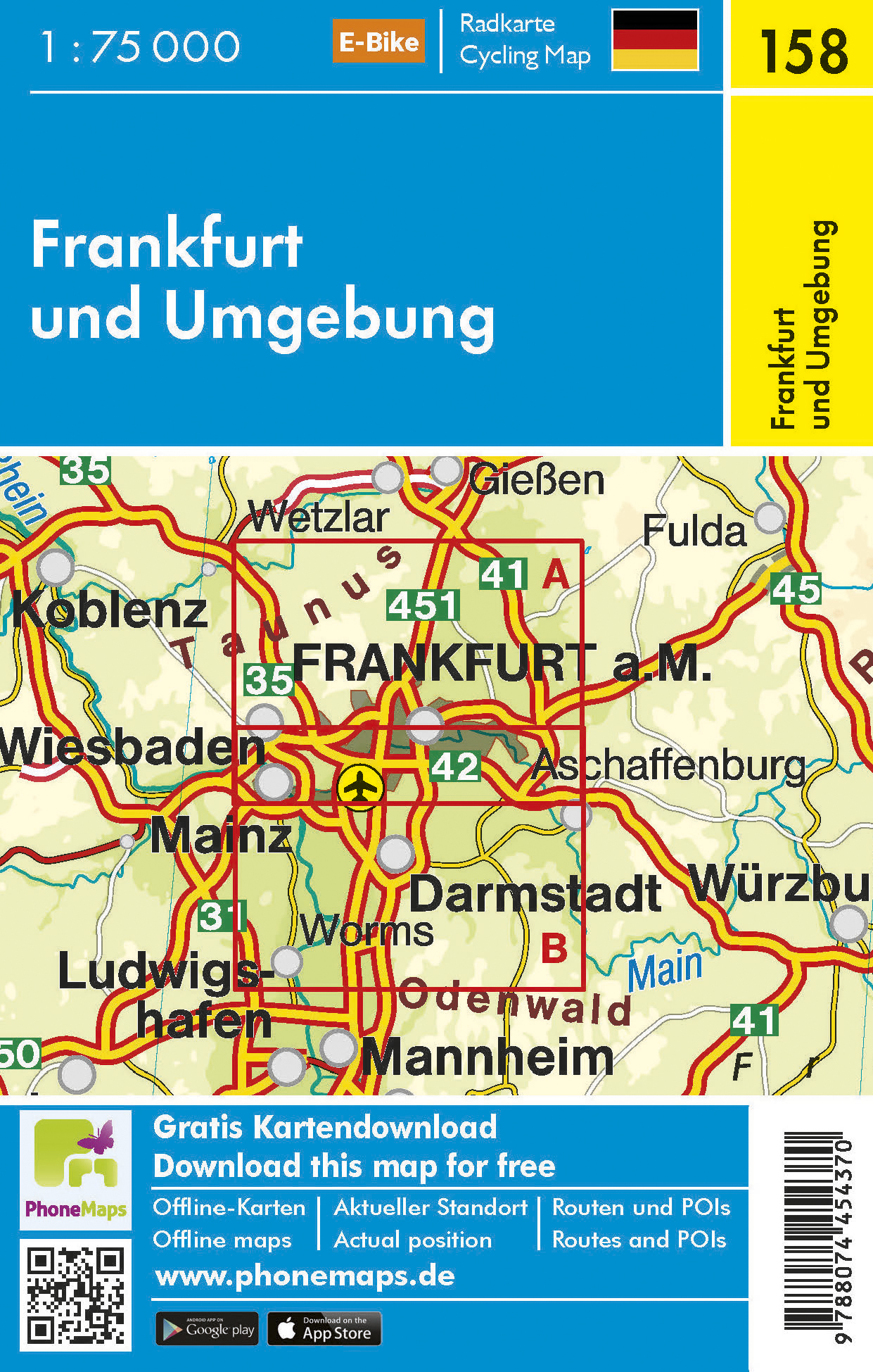 Die Radkarte Frankfurt und Umgebung im Maßstab 1:75 000, von Edition PhoneMaps, zeigt das Gebiet zwischen Frankfurt, Darmstadt, Wiesbaden, Mainz und Taunus. Die Radkarte enthält markierte Radwege sowie Radinformationen. Die Karte ist mit der App des gleichen Namens verbunden. Damit kann der Benutzer detaillierte Wander- und Radkarten aus ganze Europa kostenlos herunterladen.