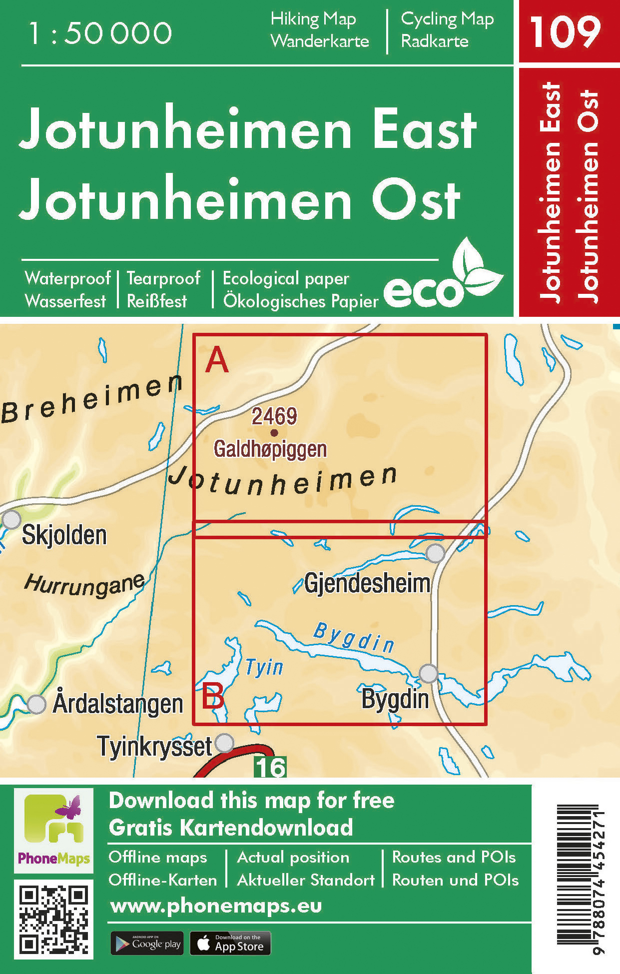 Die Wanderkarte Jotunheimen Ost im Maßstab 1:50 000, von Edition PhoneMaps, zeigt den östlichen und zentralen Teil des Nationalparks Jotunheimen einschließlich der höchsten Gipfel Glittertind und Galdhøpiggen. Die Wanderkarte enthält markierte Wander- und Radwege sowie touristische und Radinformationen. Die Karte ist auf einem innovativen ökologischen Papier produziert. Das Papier ist naturfreundlich, recycelbar, wasserfest und unzerreißbar und somit ideal für Outdoor-Aktivitäten. Die Karte ist mit der App des gleichen Namens verbunden. Damit kann der Benutzer detaillierte Wander- und Radkarten aus ganze Europa kostenlos herunterladen.
