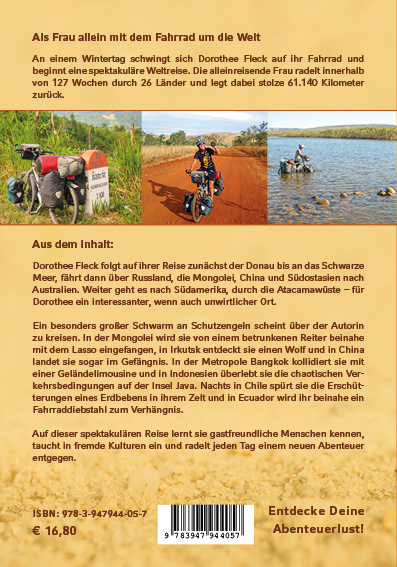 Dorothee Fleck ist 44 Jahre alt, als sie beschließt, ihre Stelle als Projektmanagerin in einem internationalen Pharmaunternehmen zu kündigen. Nach 17 Jahren war der Alltag zu sehr zur Routine geworden, Änderungen zeichneten sich nicht ab. Täglich fuhr sie knapp 20 Kilometer mit dem Rad ins Büro und träumte davon, eines Tages einfach weiterzufahren: nach Afrika, nach Südostasien, am besten um die ganze Welt. Auf Geschäftsreisen hatte sie schon viel von der Welt gesehen, wollte den Erdball aber viel lieber aus einem anderen Blickwinkel erleben. Ihre Radfahrerinnen-Biografie kann sich sehen lassen: Bereits mit 14 Jahren machte sie ihre erste Biketour zusammen mit einer Freundin an den Bodensee. Später radelte sie nach Frankreich und Italien, durch die USA, nach Afrika und Madagaskar.