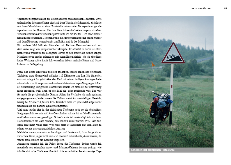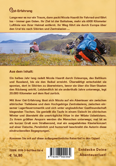 Ein halbes Jahr lang radelt Nicola Haardt durch Osteuropa, das Baltikum und Russland, bis sie den Baikal erreicht. Überwältigt entscheidet sie spontan, dort in Sibirien zu überwintern, bevor sie über die Stan-Staaten den Rückweg antritt. Letztendlich ist sie anderthalb Jahre unterwegs, legt 20.000 km auf dem Rad zurück. Mit ihrer Ost-Erfahrung lässt sich Nicola auf ein Abenteuer ein zwischen sibirischer Tiefebene und dem Hochgebirge Zentralasiens, zwischen einsamer Lagerfeuerromantik und sich unter unglaublicher Gastfreundschaft biegenden Tischen. Sie genießt die Taufe in einem Eisloch im sibirischen Winter und übersteht die unerträgliche Hitze in der Wüste Usbekistans. Zu ihrem größten Ansporn werden die Menschen unterwegs; mal ist es ein kurzer Gruß vom Straßenrand, mal ein ausgedehntes Klavierkonzert auf einer Datscha. Persönlich und humorvoll beschreibt die Autorin diese eindrucksvollen Begegnungen.