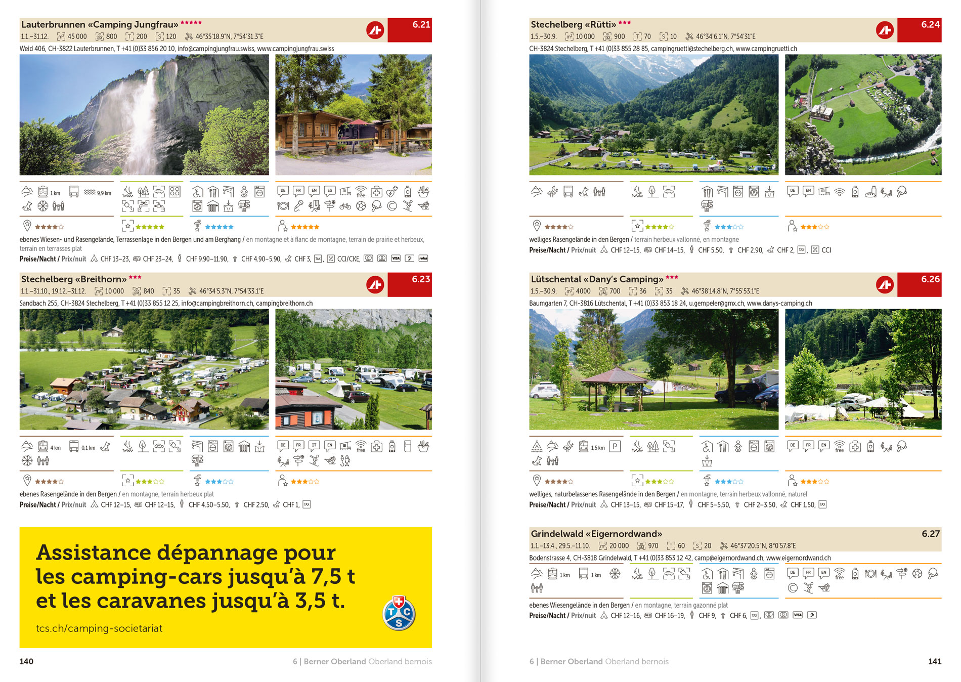 - Über 175 Schweizer Campingplätze, im gedruckten Campingführer mit Bilder und Angaben zu den Bewertungen der vier Unterkategorien Lage, Ausbau, Sanitäre Anlagen und Dienstleistungen bei den Campingplätzen in der Schweiz. Die Campingplätze in der Schweiz werden regelmässig vom Verband Schweizerischer Campings, dem Schweizerischen Camping und Caravanning Verband und vom Touring Club Schweiz bewertet und klassifiziert.