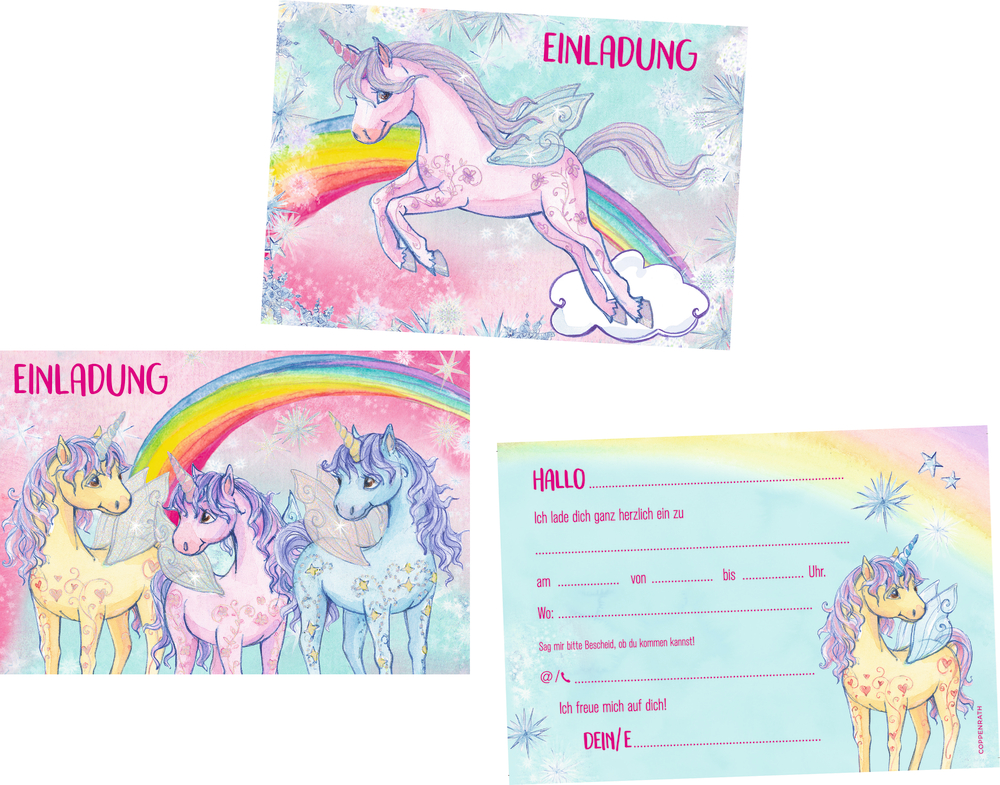 Mit diesen funkelnden Einladungskarten aus dem Einhorn-Paradies können 10 Freundinnen und Freunde einfach und originell eingeladen werden. Ob Geburtstag, Übernachtungsparty, Einschulung ... einfach den Text ergänzen und per Post verschicken oder persönlich übergeben. Und der Spaß kann beginnen! Das Set enthält 10 Einladungskarten und Umschläge.
