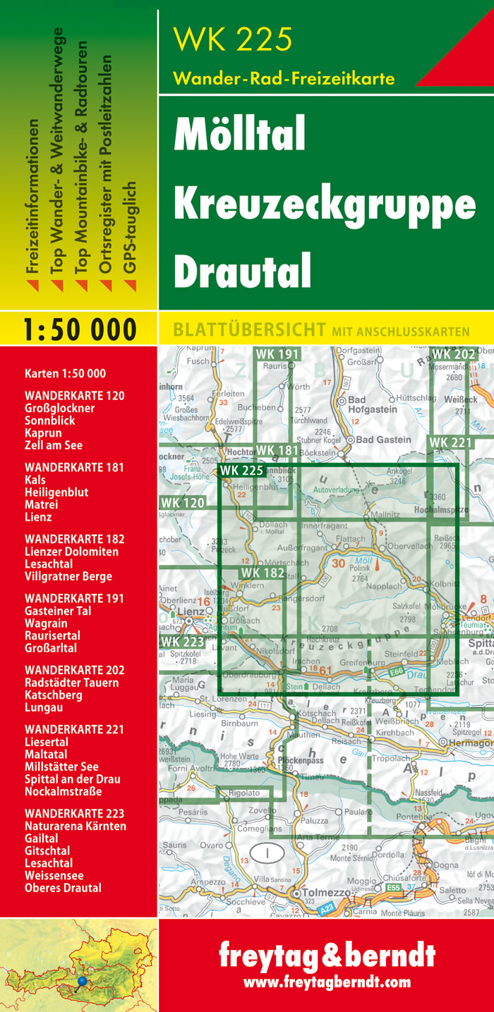 freytag & berndt Wanderkarten sind dank der detaillierten digitalen Kartographie und der genauen Maßstäbe ideale Begleiter beim Wandern, Bergsteigen und auf Skitouren. Sie werden regelmäßig überarbeitet und enthalten aktualisierte Informationen zu Wanderwegen, Rad- und Mountainbikestrecken, Hütten, Naturdenkmälern, kulturellen Sehenswürdigkeiten und Freizeiteinrichtungen. Das beiliegende Informationsheft enthält eine Auswahl der besten Wanderwege, Radwege und Mountainbikestrecken sowie eine kurze Beschreibung der einzelnen Gemeinden mit ihrem Freizeitangebot. (Sprache: Deutsch) Freizeitinformationen, Wander- und Weitwanderwege, Mountainbike- und Radtouren, Ortsregister mit Postleitzahlen, GPS-tauglich, Klettersteig, Schiroute, Langlaufroute, Nordic-Walking-Strecke; Region: Osttirol, Oberkärnten, Oberes Drautal, Mölltal; Besondere Wander-Themenwege: Rupertiweg, Jakobsweg, Arnoweg, Salzburger Almenweg, Alpe Adria Trail, Hoher Sonnblick, Kreuzeck, Hochstadel, Ankogel; Spezielle Rad- und Mountainbiketouren: Drauradweg, Glockner Radweg, Zirknitztal, Nigglaital Runde; Umgebungskarten: WK 120, WK 181, WK 182, WK 191, WK 202, WK 221, WK 223;