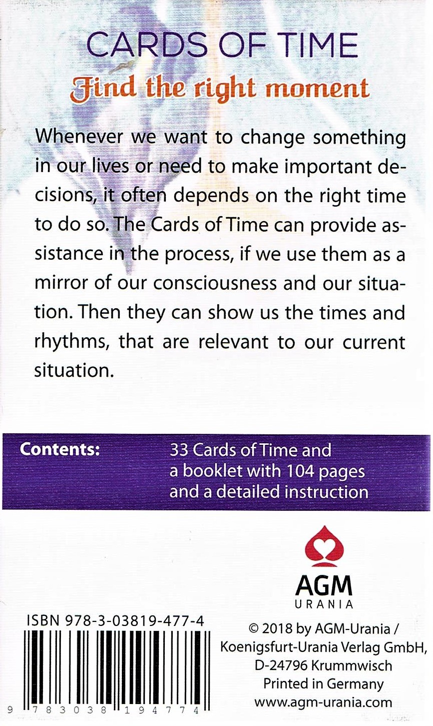 Whenever we want to change something in our lives or need to make important decisions, it often depends on the right time to do so. The Cards of Time can provide assistance in the process, if we use them as a mirror of our consciousness and our situation. Then they can show us the times and rhythms, that are relevant to our current situation.The perfect companion cards for all kind of readings; Tarot, Lenormand or Kipper!