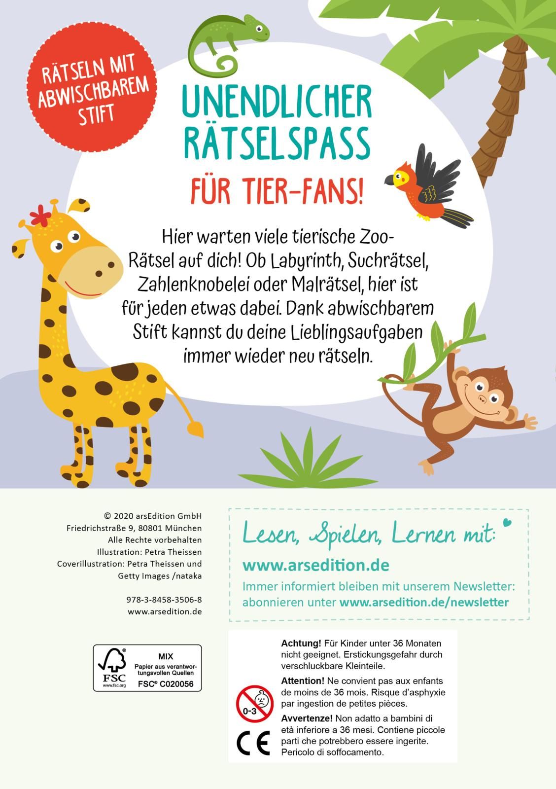 Unendlicher Rätselspaß für Tier-Fans!Hier warten viele lustige Zoo-Rätsel auf kleine Knobelfreunde ab 4 Jahren! Ob Labyrinth, Suchrätsel, Zahlenknobelei oder knifflige Logikrätsel, bei den kindgerechten Aufgaben ist für jeden etwas dabei. Niedliche Welten: Alle Rätsel spielen im ZooSüß illustriert: Kindgerechte Illustrationen lassen Augen leuchtenStift dabei: Mit dem trocken abwischbaren Stift können die Kinder sofort loslegenTolles Geschenk: Als Mitbringsel für Kinder ab 4Kleines Format für unterwegs und daheim: Nie wieder Langeweile auf Reisen, im Wartezimmer oder zwischendurchMit abwischbarem StiftDem Heft liegt ein abwischbarer Stift bei, mit dem die Kinder die niedlichen Rätsel rund um Löwe, Elefant & Co. immer wieder neu lösen können. Ist eine Lösung falsch, lässt sich die Tinte ganz ohne Wasser oder Reinigungsmittel nur mit einem Taschentuch entfernen - einfach ruckzuck weggewischt!