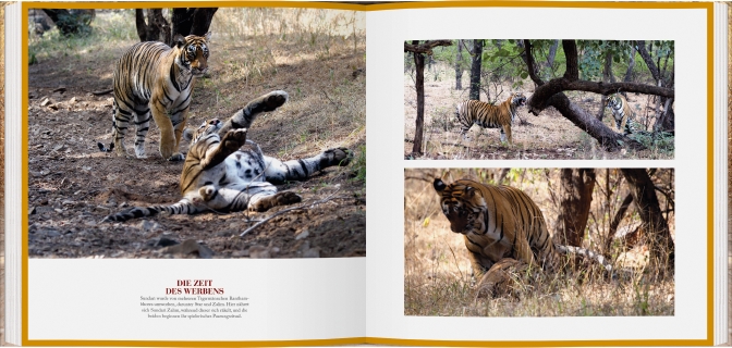 Bina Kak hat die Tiger von Ranthambhore jahrelang beobachtet und berichtet in diesem Buch von ihren Begegnungen mit den faszinierenden Tieren. Ihre Fotos zeugen von der unvergleichlichen Schönheit der Tiger. Indien ist ein Schlüsselland für das Überleben dieser Art; 2014 wurden hier 2226 Exemplare gezählt, weltweit leben nur noch cirka 3890 in freier Wildbahn. Dieses Buch ist eine Hommage an die majestätischen Großkatzen und soll dazu beitragen, dass ihr Bestand weiter wächst; ein Teil des Verkaufserlöses geht an Prakratik, einer 1994 gegründeten Vereinigung für das harmonische Zusammenleben von Menschen und Tigern im Ranthambhore Nationalpark.