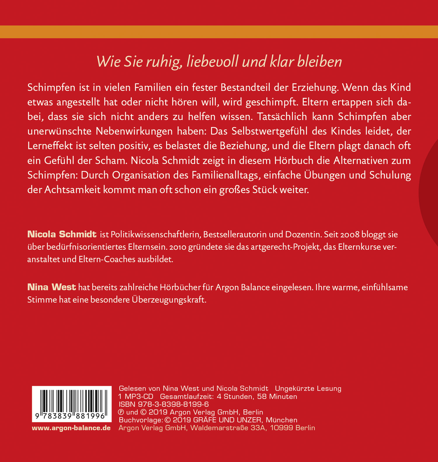 Schimpfen ist in vielen Familien ein fester Bestandteil der Erziehung. Wenn das Kind etwas angestellt hat oder nicht hören will, wird geschimpft. Eltern ertappen sich dabei, dass sie sich nicht anders zu helfen wissen. Tatsächlich kann Schimpfen aber unerwünschte Nebenwirkungen haben: Das Selbstwertgefühl der Kinder leidet, der Lerneffekt ist selten positiv, es belastet die Beziehung, und die Eltern plagt danach oft ein Gefühl der Scham. Nicola Schmidt zeigt in diesem Hörbuch die Alternativen zum Schimpfen: Durch Organisation des Familienalltags, simple Minuten-Übungen und Schulung der Achtsamkeit kommt man oft schon ein großes Stück voran.