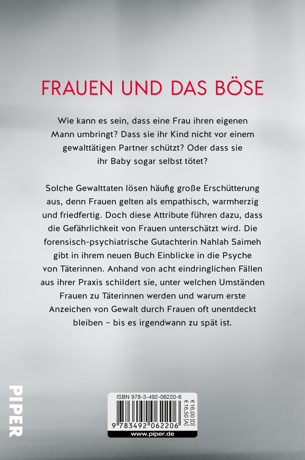 Auch Frauen sind zu Gewalttaten fähig, bringen ihre Partner um, machen sich des Kindesmissbrauchs schuldig oder töten ihre Babys. Nahlah Saimeh erlebt als Gerichtsgutachterin jedoch häufig, wie stark das Frauenbild mit Attributen wie Friedfertigkeit, Mütterlichkeit oder Empathie verknüpft wird. Aber gibt es sie wirklich, die friedfertige Frau? Die forensische Psychiaterin ist der Ansicht, dass die potenzielle Gefährlichkeit von Frauen in unserer Gesellschaft pauschal unterschätzt wird. Anhand eindringlicher Fälle aus ihrer Praxis schildert sie, unter welchen Umständen Frauen zu Täterinnen werden und warum erste Anzeichen von Gewalt durch Frauen oft unentdeckt bleiben - bis es irgendwann zu spät ist.