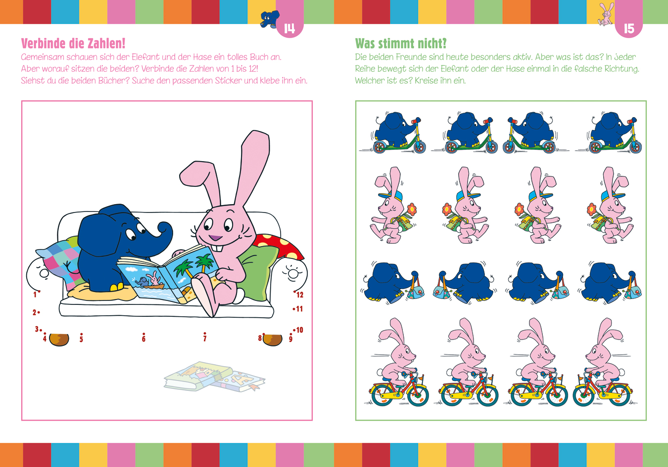 Malen • Rätseln • Stickern mit Elefant und Hase