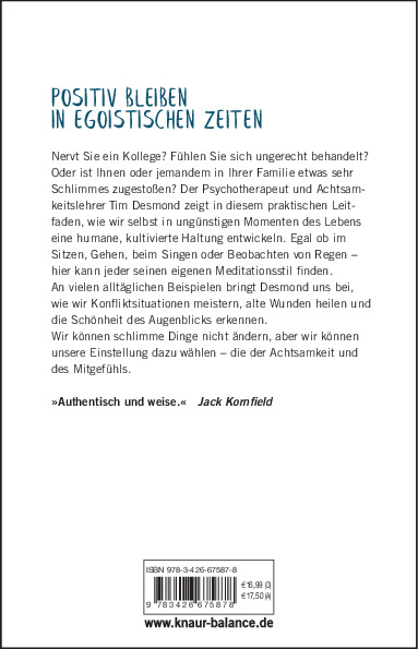 Der Psychotherapeut und Achtsamkeitslehrer Tim Desmond zeigt, wie wir selbst in ungünstigen Momenten des Lebens eine humane, kultivierte Haltung bewahren. Nervt Sie ein Kollege? Fühlen Sie sich ungerecht behandelt? Oder ist Ihnen oder jemandem in Ihrer Familie etwas sehr Schlimmes zugestoßen?