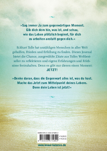 Eckhart Tolle gilt als einer der bekanntesten und einflussreichsten spirituellen Lehrer der Gegenwart. Seine profunde Lehre gründet sich auf die Kraft der Gegenwart. Es gibt nur diesen einen Moment: Jetzt! Nur im Jetzt finden wir den Eingang in unsere innere Glückseligkeit. Tolle ist davon überzeugt, den gegenwärtigen Moment immer anzunehmen, wie er ist, denn so beginnt das Leben, wundervolle Dinge hervorzubringen. Mit seinen einfach verständlichen Weisheiten hat er bereits unzähligen Menschen in aller Welt geholfen, Frieden und größere Erfüllung zu finden. Jetzt! - Das Journal beinhaltet knapp siebzig seiner einzigartigen Zitate seiner spirituellen Weisheit und bietet viel Platz zum Eintragen eigener Erfahrungen und Erlebnisse im Hier und Jetzt.