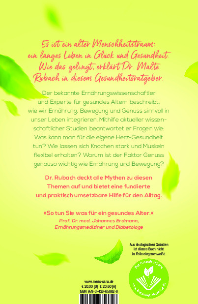 Wie lautet also die Wunder-Formel? Kurz gesagt: Es geht um das richtige Maß an Ernährung, Bewegung und Genuss. Der gefragte promovierte Ernährungswissenschaftler und Experte für gesundes Altern Dr. Malte Rubach erklärt in seinem neuen Gesundheits-Ratgeber mithilfe aller aktuellen wissenschaftlichen Studien, wie es gelingt, gesund und glücklich alt zu werden. Was kann man zum Beispiel für die eigene Herz-Gesundheit tun? Wie lassen sich Knochen stark und Muskeln flexibel und voller Energie erhalten? Warum ist der Faktor Genuss genauso wichtig wie Ernährung und Bewegung? Dr. Rubach deckt alle Mythen zum Thema „Gesund altern“ auf: Weshalb leben die Menschen in den sogenannten Blue Zones der Welt wirklich länger? Verkürzt der Konsum von tierischen Produkten das Leben tatsächlich? Diesen und vielen weiteren Fragen geht er auf den Grund. Fundiert und praktisch umsetzbar mit Hilfe von kleinen Übungen für den Alltag bietet er eine kompakte Essenz des aktuellen Forschungsstands.