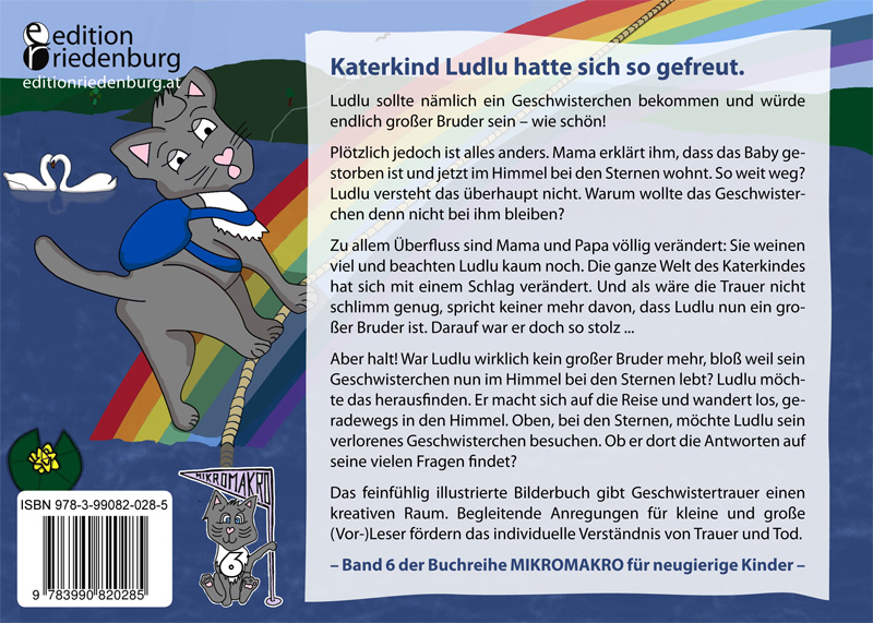Katerkind Ludlu spielt in seinem Zimmer mit den Vorhängen. Sie flattern im Wind und er versucht, sie zu erhaschen. Als er sich im dünnen Stoff verheddert, bleibt er auf dem Teppich liegen. Ludlu schaut durch das Fenster in den Himmel hinauf. Er sucht einen ganz bestimmten Stern. Von Mama weiß er nämlich, dass sein Geschwisterchen jetzt als kleines Sternchen im Himmel lebt. Leider ist es gestorben, bevor Ludlu das erste Mal „Miau“ zu ihm sagen konnte. Dummerweise spricht jetzt auch keiner mehr davon, dass Ludlu ein großer Bruder geworden ist. Dabei hatte sich Ludlu so sehr darauf gefreut, ein Geschwisterchen zu bekommen! Er hatte sogar schon ein Bild gemalt, auf dem die ganze Familie mit dem Katzenbaby zu sehen ist. Normalerweise liebt Ludlu es, Bilder zu malen. Aber dieses Bild hat er vor lauter Wut nun zerknüllt und in den Papierkorb geworfen. Der kleine Kater versteht einfach nicht, warum sein Geschwisterchen so weit weg von ihm wohnt. Wäre es auf der Erde geblieben, hätte es jetzt mit ihm am Vorhang schaukeln können. Einen Vorhang bis in den Sternenhimmel? Den gibt es leider nicht. Aber vielleicht etwas anderes. Geknickt tapst Ludlu ins Wohnzimmer. Lustlos rollt er einen Filzball vor sich her. Mama und Papa sitzen im Katzenkörbchen und weinen. Sie sehen ganz zerstrubbelt aus. Offenbar nehmen sie es mit der Pflege ihres Felles nicht mehr so genau. Ludlu erinnert sich, dass seine Eltern vor dem Tod des Babys stundenlang alle Fellhaare mit ihrer rauen Zunge geglättet haben. Auch ihm hatten sie gezeigt, wie das geht, und gesagt, wie wichtig die tägliche Abschleckerei für eine Katze ist. Jetzt aber bemerken Mama und Papa Ludlu trotz ihrer sehr guten Ohren nicht einmal. Ludlu blickt im Zimmer umher. Überall ist Unordnung. Der Kratzbaum ist umgefallen, Spielsachen liegen auf dem Boden, Ludlus Bilder sind nicht aufgehängt und sogar das Katzengras ist vertrocknet. Ludlu verkriecht sich im Untergeschoss des Kratzbaums. Wie sehr hatte er sich auf sein Geschwisterchen gefreut! Er wollte dem Baby doch so viel beibringen und mit ihm gemeinsam spielen! Und jetzt sind alle einfach nur schrecklich traurig.