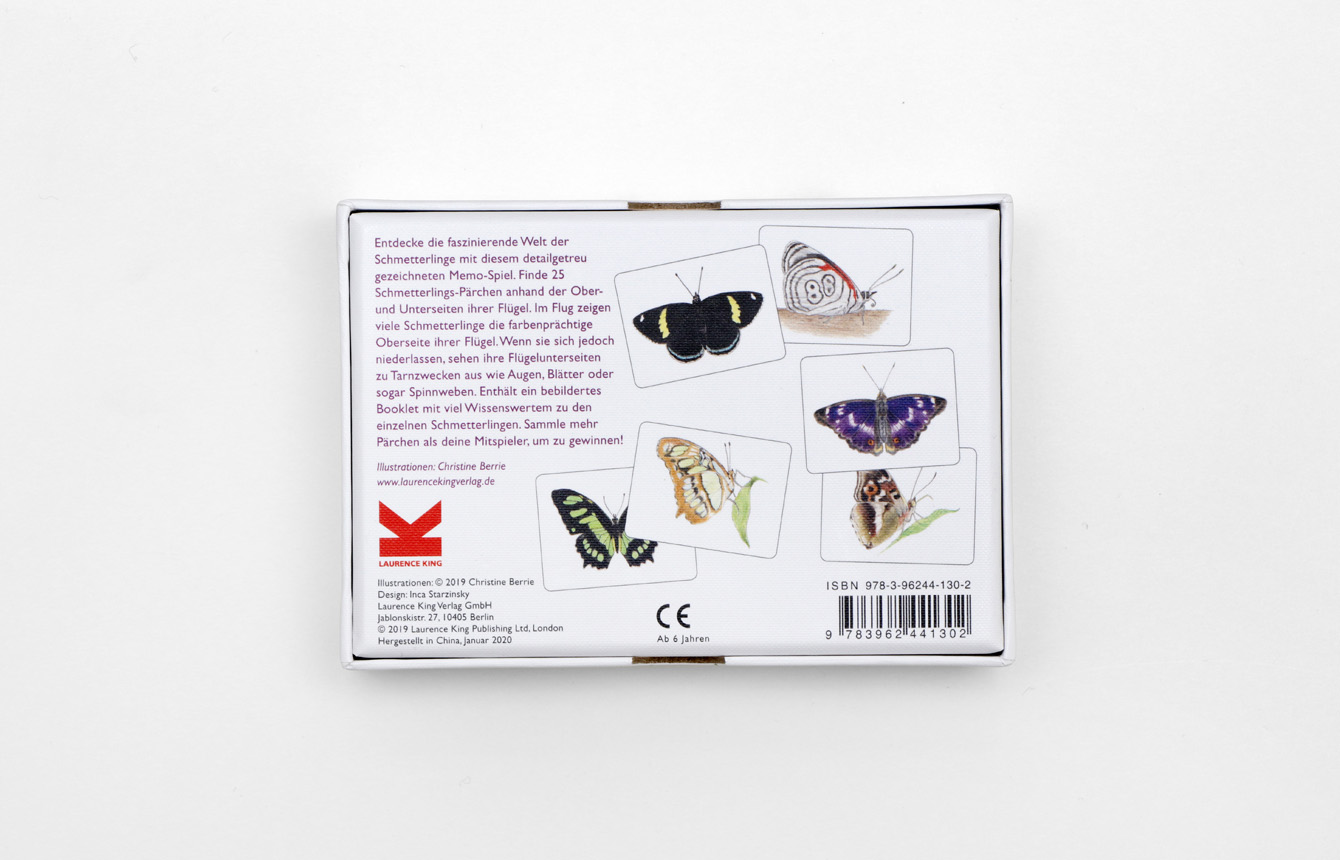 | Schlagworte | Artenvielfalt • Aussterben • Bedrohte Tierart • Bildung • Falter • Familienspiel • Gedächtnistraining • Insekten • Klimaschutz • Memo-Spiel • Naturgesetz • Naturkenntnis • Naturkunde • Naturliebhaber • Naturschutz • Schmetterlingarten • Tierillustration |