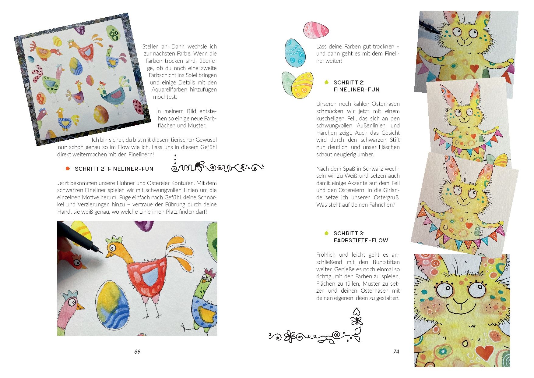 Schneeglöckchen, Narzissen und Osterhasen: Clarissa Hagenmeyer entführt die Leser mit ihrem neuen Buch auf eine farbenfrohe Frühlingswiese. Mit der bewährten 4-Schritte-Technik mit Aquarellfarben, Fineliner-Fun und Farbstifte-Flow zaubert jeder innerhalb kürzester Zeit kreative Motive auf das Blatt. Es gibt kein richtig und kein falsch - solange man Freude am Malen hat, ist das Ziel erreicht. Und zur Belohnung gibt es niedliche Motive, die man auch für Geschenkanhänger oder Einladungen verwenden kann.