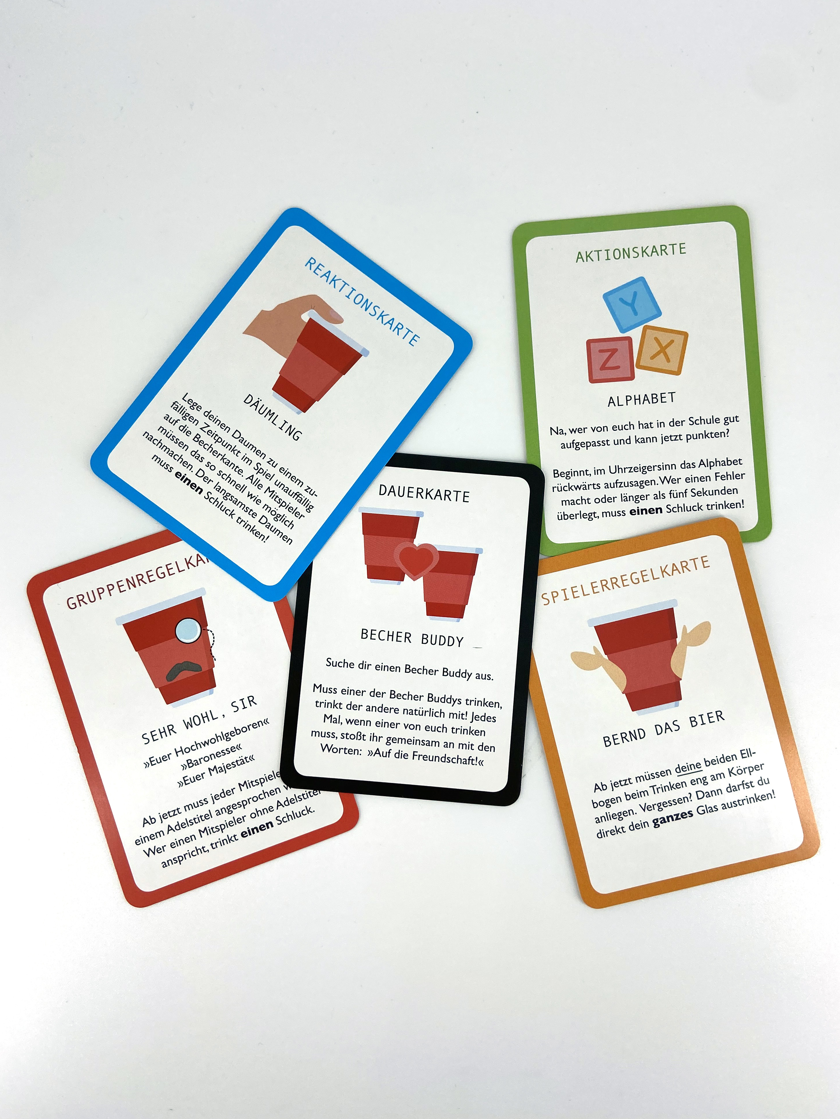 Endlich ein Trinkspiel, das wirklich Spaß macht!Mit diesem stimmungsgeladenen Kartenspiel machst du deine Party zu einem unvergesslichen Erlebnis. Eine kunterbunte Mischung aus feuchtfröhlichen Aktions- und Regelkarten peppt die Stimmung auf und bringt deine Gäste miteinander ins Gespräch.Aber Achtung: Kannst du eine Aufgabe nicht lösen oder hast du eine Regel vergessen, musst du zur Strafe natürlich einen bechern.Wer wird einen kühlen Kopf bewahren? Wer beweist Improvisationstalent? Und wer liegt zu fortgeschrittener Stunde als Erster unterm Tisch? Finde es heraus beim ultimativen Trinkspiel für dich und deine Freunde.