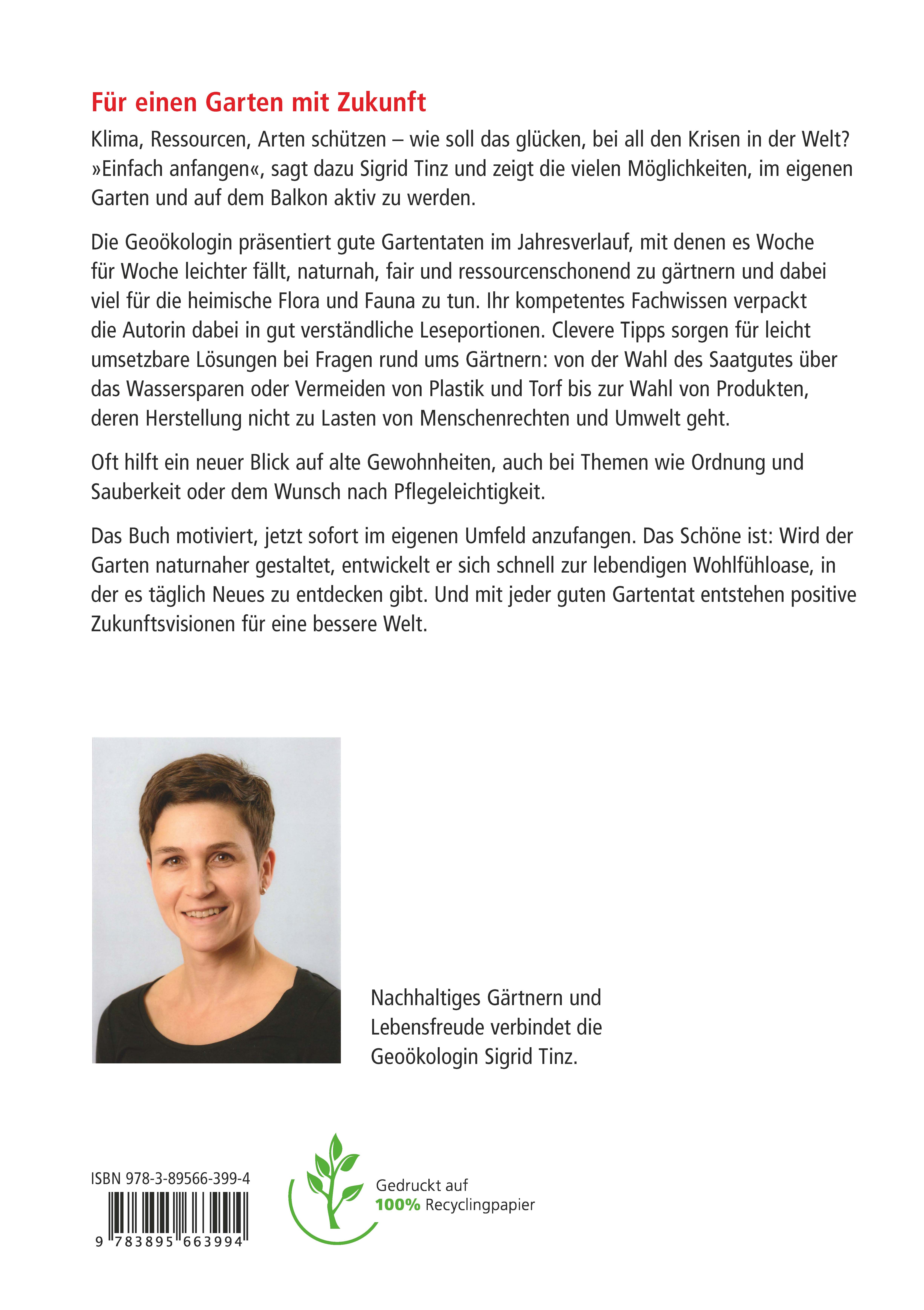 Sigrid Tinz, geboren 1975, ist freie Journalistin und Buchautorin für Umwelt-, Natur- und Gartenthemen. Die Geoökologin lebt mit ihren vier Kindern, Katzendame Miezi und Schäferhündin Mary im Münsterland. Ihre liebste Freizeitbeschäftigung: der kleine Familiengarten voller selbstständiger Blumen, die Groß und Klein viel gemeinsame Zeit für entspannte und spannende Naturerlebnisse lassen.