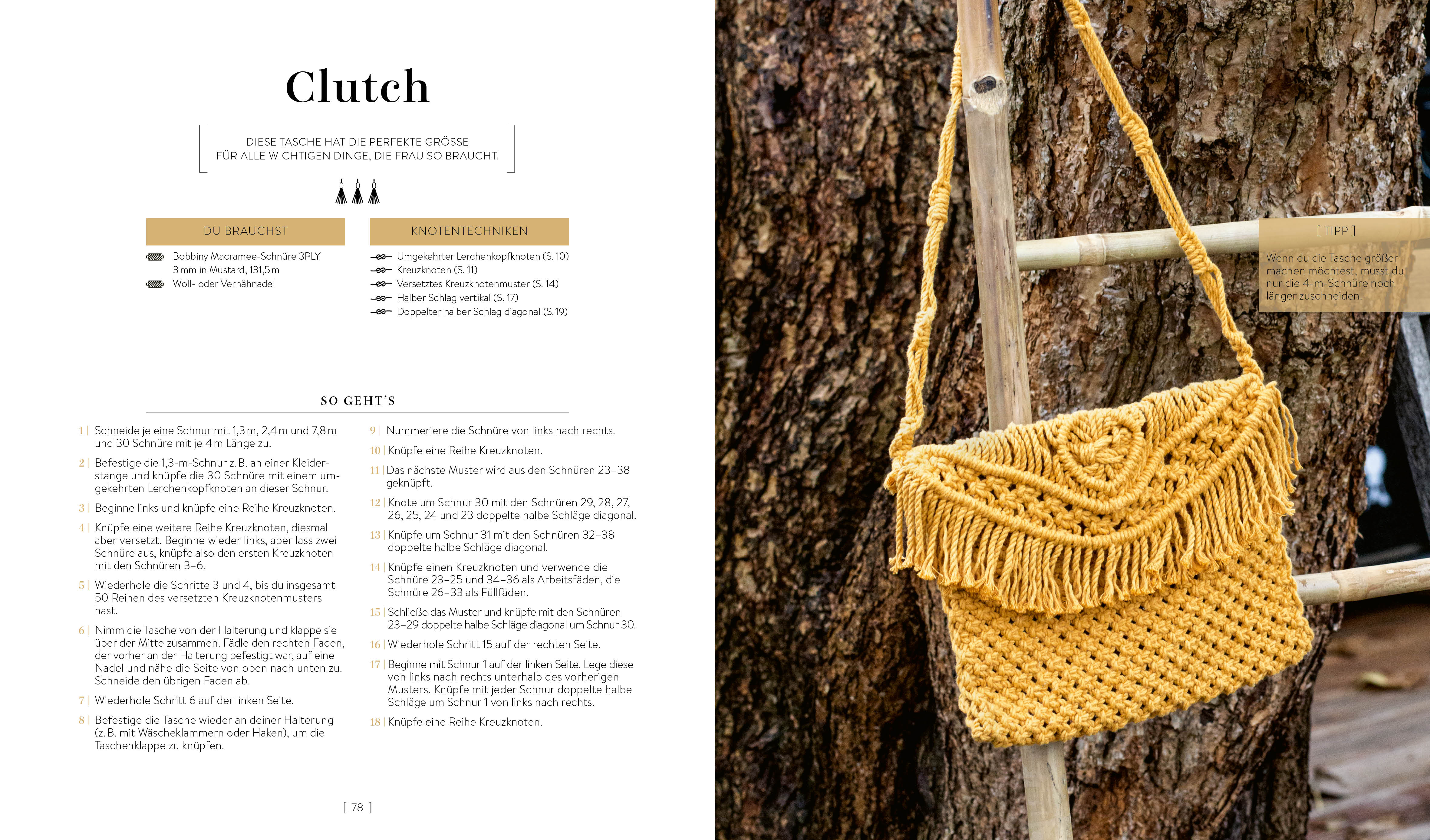 Bohemian-Style! Die moderne Knüpfkunst Makramee bringt neuen frischen Wind in die eigenen vier Wände. Neben Lampenschirm und Blumenampel können auch tolle kleine Geschenke und nützliche Gegenstände geknüpft, geflochten und geknotet werden, wie z.B. Schlüsselanhänger, Ohrringe oder Greifringe. Mehr als 20 moderne Knüpfprojekte werden leicht erklärt und ausführlicher erklärt, sodass die Kunstwerke aus Garn schnell umgesetzt sind. In den drei Kapiteln zu den Themen "cosy", "natural" und "happy" findet man vom hübschen Wandschmuck bis hin zum bunten Mobile für jedes Knüpfherz das Richtige. Knüpf on!