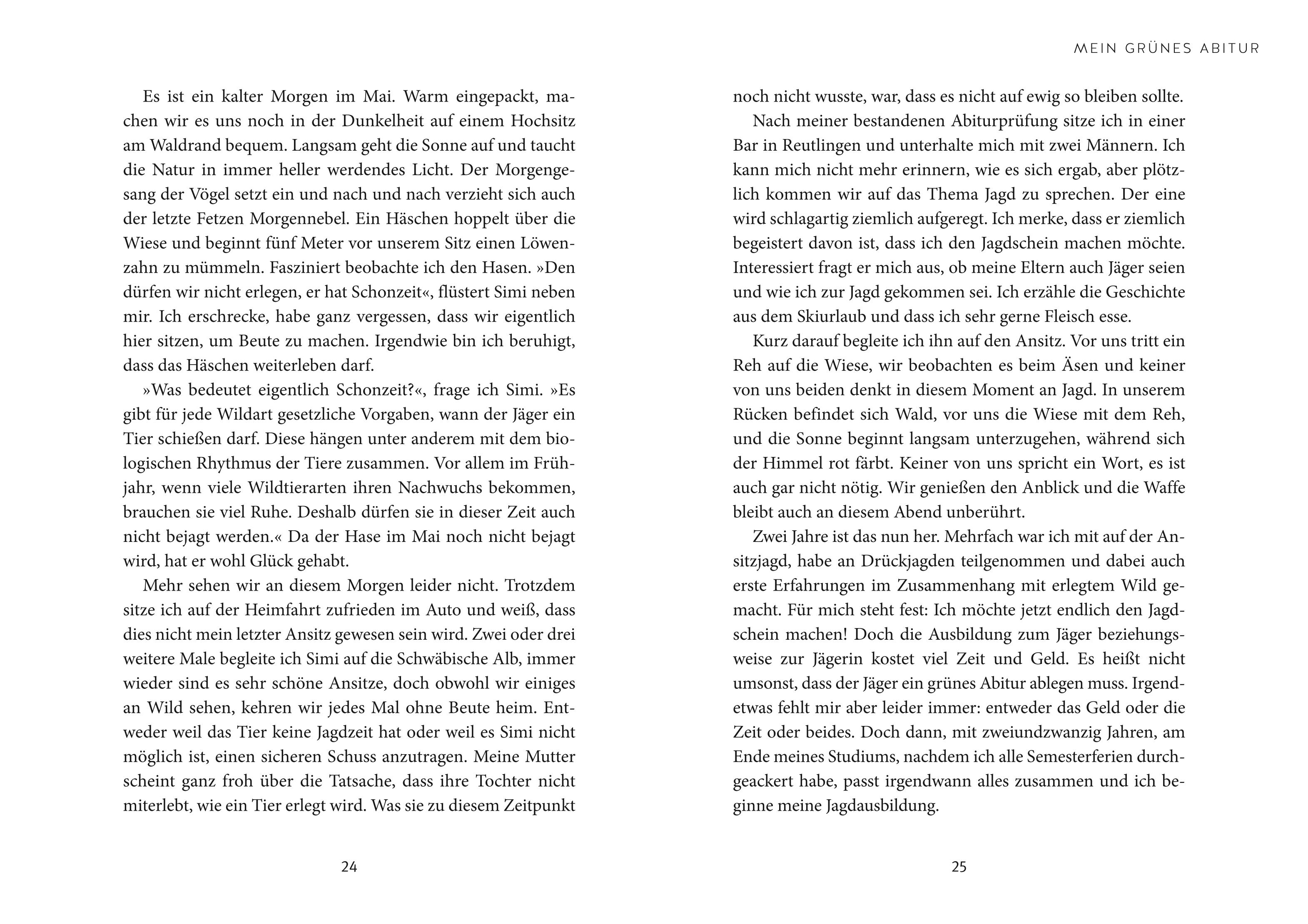 Mit frischem Blick berichtet die junge Jägerin, Jagdredakteurin und "Exotin" in den immer noch männlich geprägten Jagdkreisen von ihren Erlebnissen: warum sie sich dazu entschloss, das grüne Abitur zu machen, von ihrer Jagdleidenschaft und wie ihr persönliches Umfeld und nicht zuletzt andere Jäger darauf reagierten. In diesem Buch legt sie offen, wie das jahrtausendealte Handwerk der Jagd in ein modernes Leben integrierbar ist und es bereichern kann, nicht nur durch den Gewinn von gesundem Wildfleisch. Schließlich stellt sie sich auch Themen, die jeden Jäger und jede Jägerin angehen: die Frage nach dem schlechten Gewissen beim Töten und was passiert, wenn einmal ein Schuss danebengeht.