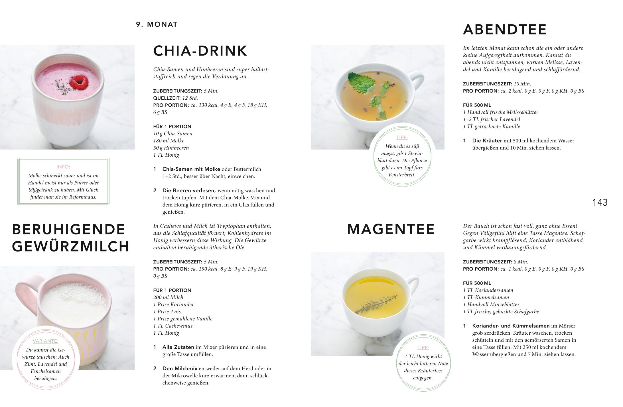 Im Kochbuch werden die einzelnen Schwangerschaftsmonate genau dargestellt - immer mit einer Übersicht, welche Nährstoffe jetzt besonders wichtig sind. Es folgen Rezepte für Smoothies und Säfte, frische Salate, Rohkost sowie warme Mahlzeiten. Immer mit dem Hinblick auf die optimale Nährstoffversorgung.