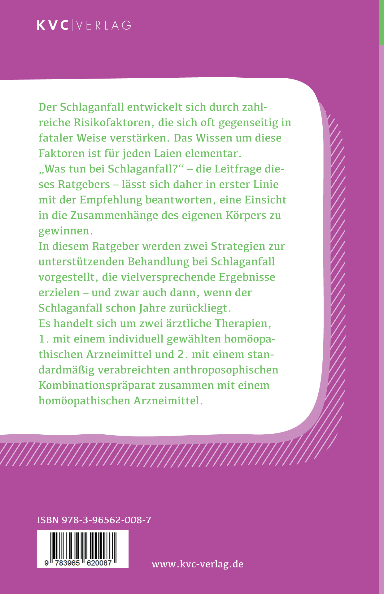 Der Schlaganfall ist die häufigste Erkrankung des Nervensystems. Er entwickelt sich auf dem Nährboden zahlreicher Risikofaktoren, die sich oft gegenseitig in fataler Weise verstärken. Das Wissen um diese Faktoren ist für jeden Laien elementar. "Was tun gegen Schlaganfall?" - die Leitfrage dieses Ratgebers - lässt sich daher in erster Linie mit der Empfehlung beantworten, eine Einsicht in die Zusammenhänge des eigenen Körpers zu gewinnen.Im praktischen Teil dieses Ratgebers werden zwei Strategien zur unterstützenden Behandlung bei Schlaganfall vorgestellt, die vielversprechende Ergebnisse erzielten - und zwar auch dann, wenn der Schlaganfall schon Jahre zurücklag. Es handelt sich um zwei ärztliche Therapien, 1. mit einem individuell gewählten homöopathischen Arzneimittel und 2. mit einem standardmäßig verabreichten anthroposophischen Kombinationspräparat zusammen mit einem homöopathischen Arzneimittel.