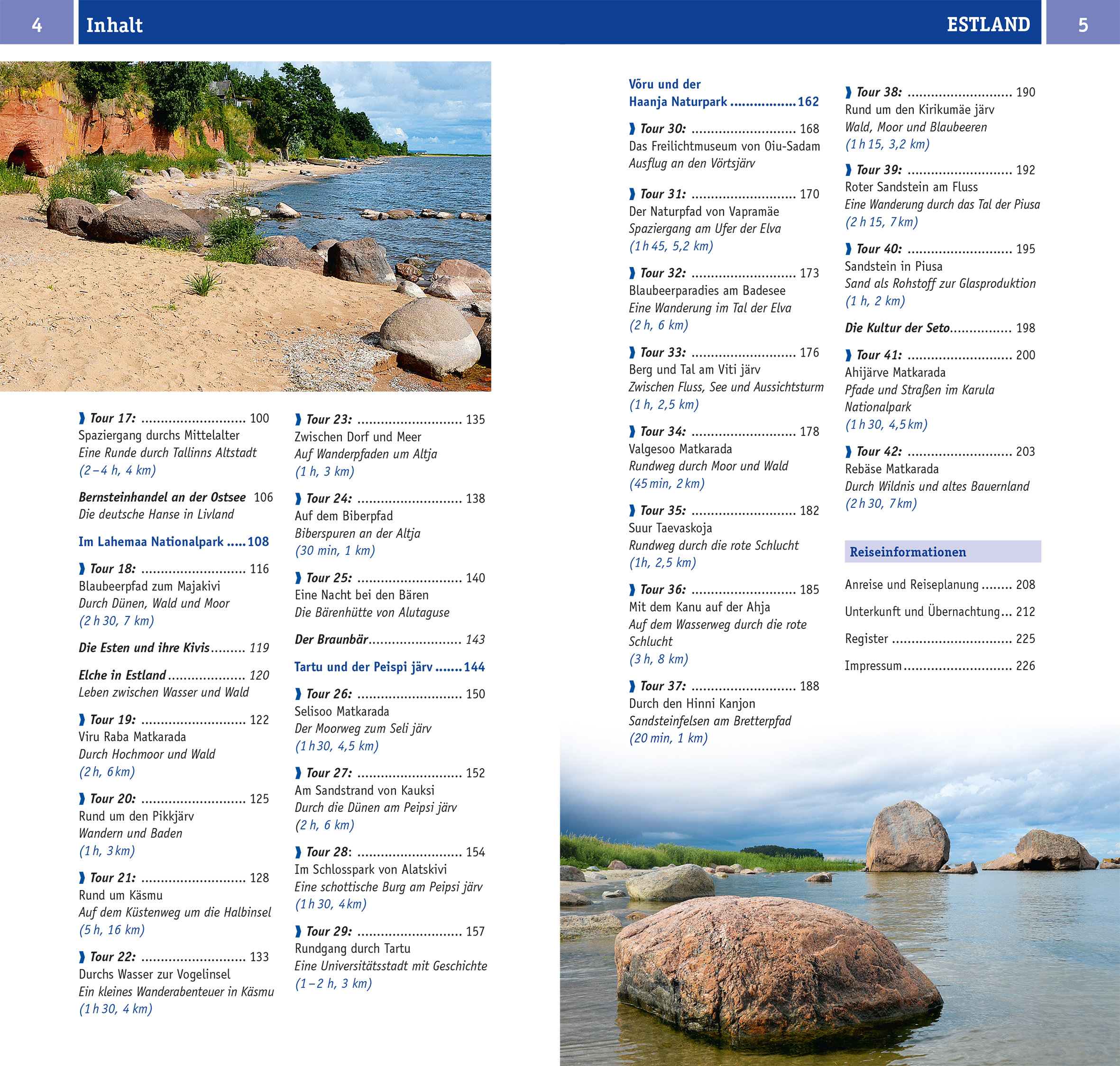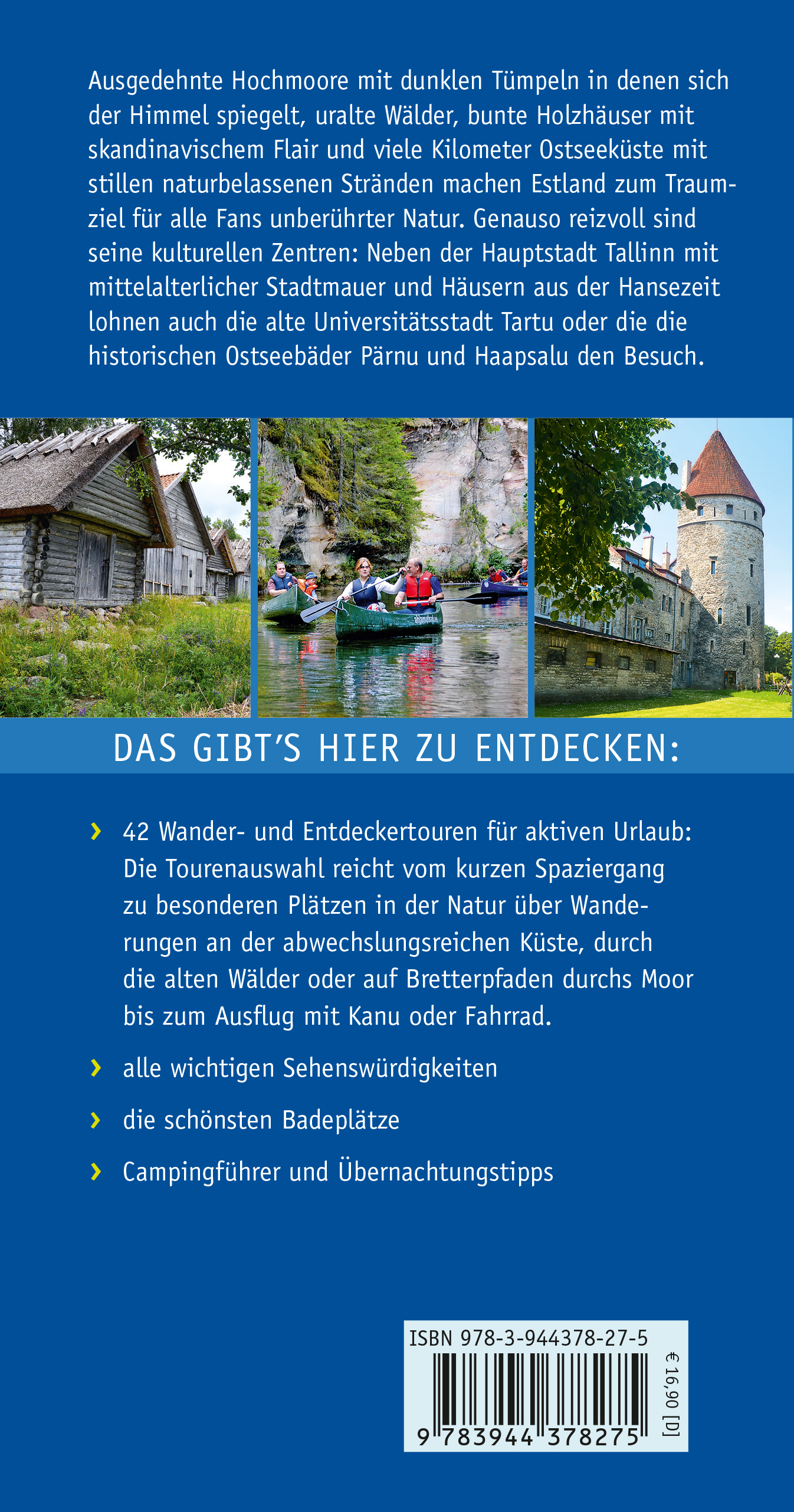 Ausgedehnte Hochmoore mit dunklen Tümpeln in denen sich der Himmel spiegelt, uralte Wälder, bunte Holzhäuser mit skandinavischem Flair und viele Kilometer Ostseeküste mit stillen naturbelassenen Stränden machen Estland zum Traumziel für alle Fans unberührter Natur. Genauso reizvoll sind seine kulturellen Zentren: Neben der Hauptstadt Tallinn mit mittelalterlicher Stadtmauer und Häusern aus der Hansezeit lohnen auch die alte Universitätsstadt Tartu oder die die historischen Ostseebäder Pärnu und Haapsalu den Besuch.- 32 Wander- und Entdeckertouren für aktiven Urlaub:Die Tourenauswahl reicht vom kurzen Spaziergang zu besonderen Plätzen in der Natur über Wanderungen an der abwechslungsreichen Küste, durch die alten Wälder oder auf Bretterpfaden durchs Moor bis zum Ausflug mit Kanu oder Fahrrad.- alle wichtigen Sehenswürdigkeiten- die schönsten Badeplätze- Campingführer und Übernachtungstipps