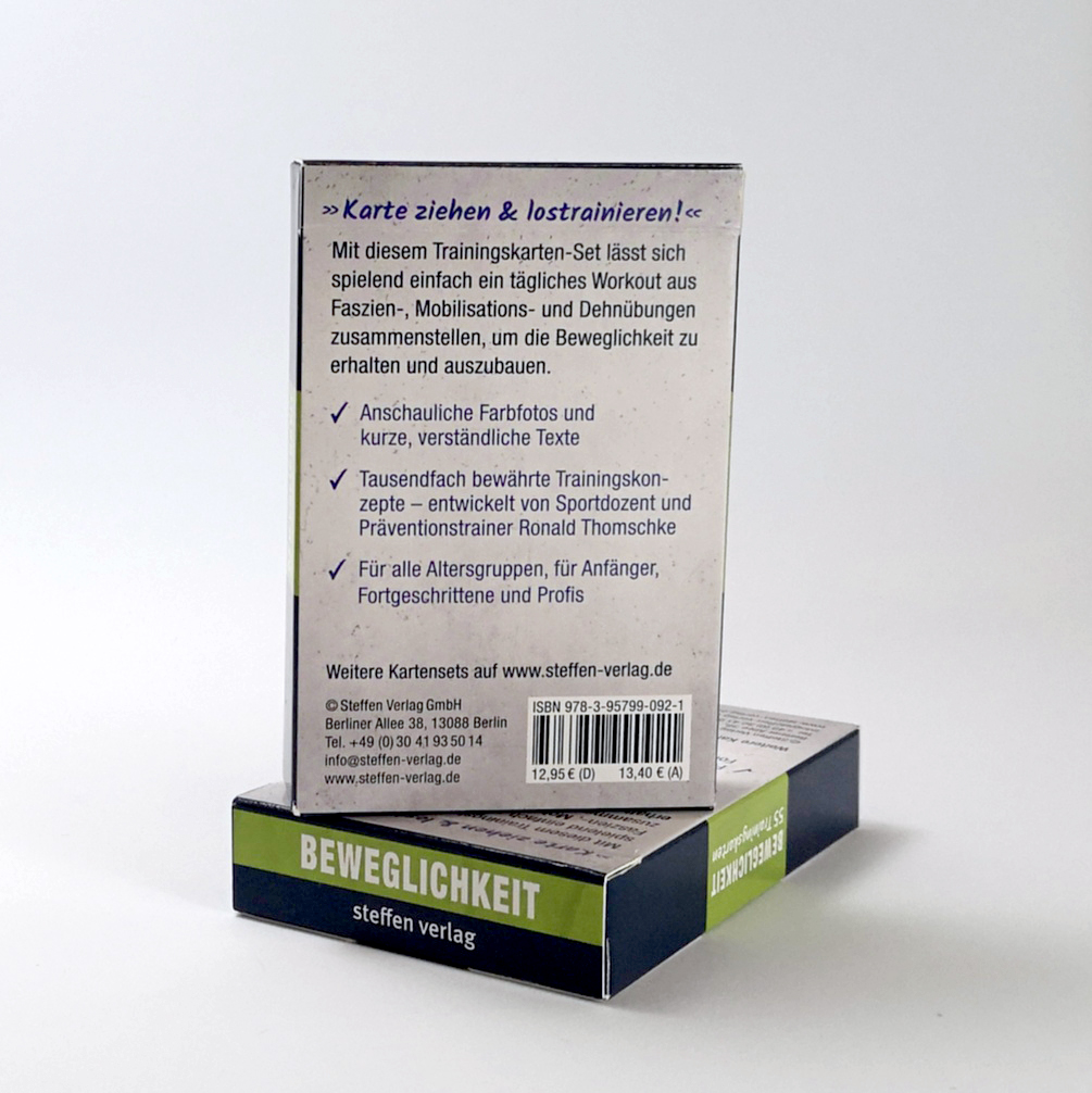 Je beweglicher ein Mensch ist, desto leichter kann er seinen Alltag bewältigen und sportliche Übungen ausführen. Die Gründe dafür sind einfach: Die Beweglichkeit beeinflusst unter anderem unsere Körperhaltung und die Funktionen der Muskulatur. Mit zunehmenden Alter und körperlicher Inaktivität nimmt die Beweglichkeit stetig ab. Mit dem Trainingskarten-Set "Beweglichkeit" lässt sich spielend einfach ein Workout aus Faszien-, Mobilisations- und Stretching-Übungen zusammenstellen, um die Beweglichkeit zu erhalten und auszubauen. Ein gutes Beweglichkeits-Training, auch bekannt unter dem Begriff Mobility Training, sorgt außerdem für eine bessere Körperhaltung.