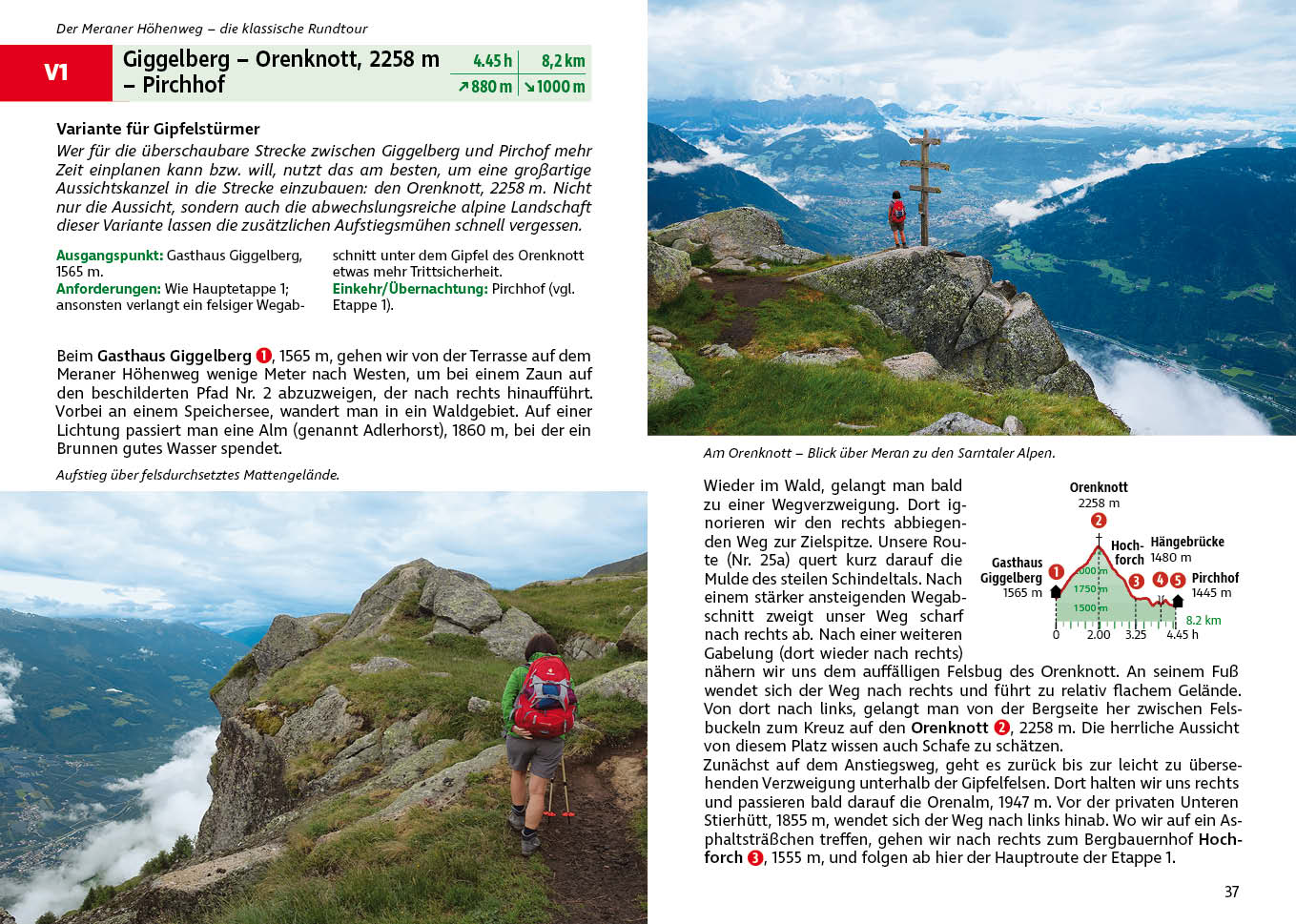 Der Meraner Höhenweg ist eine der schönsten mehrtägigen Rundwanderungen der Alpen. Auf aussichtsreichen Wegen verläuft er durch die Texelgruppe, dessen höchste Gipfel die Stadt bis zu 3000 Meter überragen. Die Hüttentour führt durch Landschaften, die von mediterran bis hochalpin reichen, zu typischen Südtiroler Bergbauernhöfen und sie gewährt immerzu grandiose die Panoramen. Der Rother Wanderführer »Meraner Höhenweg« ist die perfekte Planungsgrundlage für die fünf- bis sechstägige Tour - mit allen wichtigen Infos, Varianten und Gipfelabstechern.Auf dem Meraner Höhenweg bewegt man sich hoch oben über dem Passeiertal, über dem Etschtal und über dem Schnalstal. Immer wieder kommt man zu malerisch gelegenen Bergbauernhöfen und Almen, von denen manche auch als Quartier genutzt werden. Die Etappen der Nordseite führen durch die Hochgebirgstäler unter dem Hauptkamm der Ötztaler Alpen: das Pfossental und das Pfelderer Tal. Mehrere Weg-Varianten führen an den Spronser Seen vorbei, die zu den reizvollsten Naturschönheiten Südtirols zählen.Der Wanderführer beschreibt die klassische Route des Meraner Höhenwegs. Dazu kommen zahlreiche Varianten und Gipfelabstecher, die mitunter über die 3000er Höhe gehen. Die Etappen verfügen über zuverlässige Beschreibungen, Kartenausschnitte mit eingezeichnetem Routenverlauf und prägnante Höhenprofile. GPS-Tracks stehen zum Download von der Rother Webseite bereit. Natürlich liefert der Wanderführer auch alle wichtigen Informationen über Anbindung an Buslinien und Seilbahnen, Übernachtungsmöglichkeiten, individuelle Etappenplanung und vieles mehr.