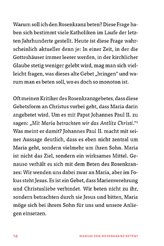 Maria ist eine Frau, die nicht ,harmlos', sondern stark ist. Wenn man das erkennt, so ist der Rosenkranz nicht mehr nur das Gebet der stillen, betagten Frau, sondern auch der jungen Abiturientin, die ihren Weg sucht, der Frauenrechtsaktivistin, die die Gesellschaft verbessern möchte, so wie der Mutter, die Job und Familie balanciert. Die Einheit, die viele Frauen spüren, wenn sie gemeinsam das Rosenkranzgebet praktizieren, führt zu einer Bestärkung der eigenen Identität mit allen Stärken und Schwächen. Dieses Buch, von einer jungen Autorin für junge Frauen geschrieben, zeigt, dass es sich lohnt, sich mit dem Rosenkranzgebet auseinanderzusetzen.