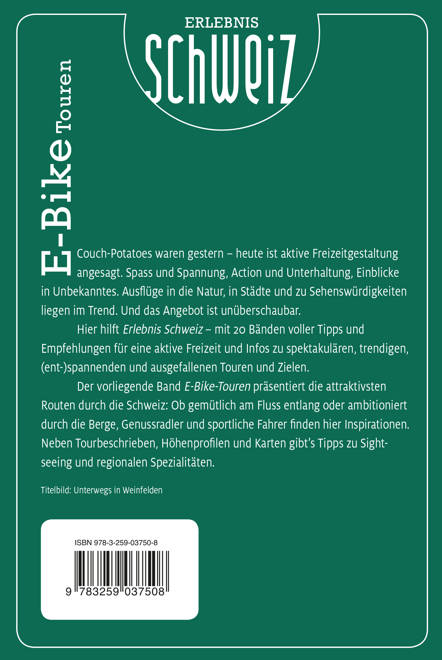 | Schlagworte | E-Bike • E-Bike Führer • e-bike touren • E-bike Tourenvorschläge • Erlebnis • Erlebnis Schweiz • E-Velo Führer • Fahrradführer • Fahrradführer Schweiz • Genussradler • Höhenprofile • Regionale Spezialitäten • Schweiz • Sightseeing • Sportliche Fahrer • Touren • Tourenbeschrieb • Veloführer |