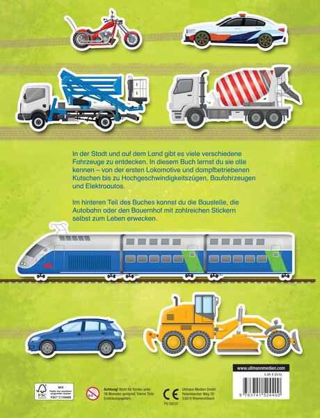In der Stadt und auf dem Land gibt es viele verschiedene Fahrzeuge zu entdecken. In diesem Buch lernst du sie alle kennen - von der ersten Lokomotive und dampfbetriebenen Kutschen bis zu Hochgeschwindigkeitszügen, Baufahrzeugen und Elektroautos. Im hinteren Teil des Buches kannst du die Baustelle, die Autobahn oder den Bauernhof mit zahlreichen Stickern selbst zum Leben erwecken.